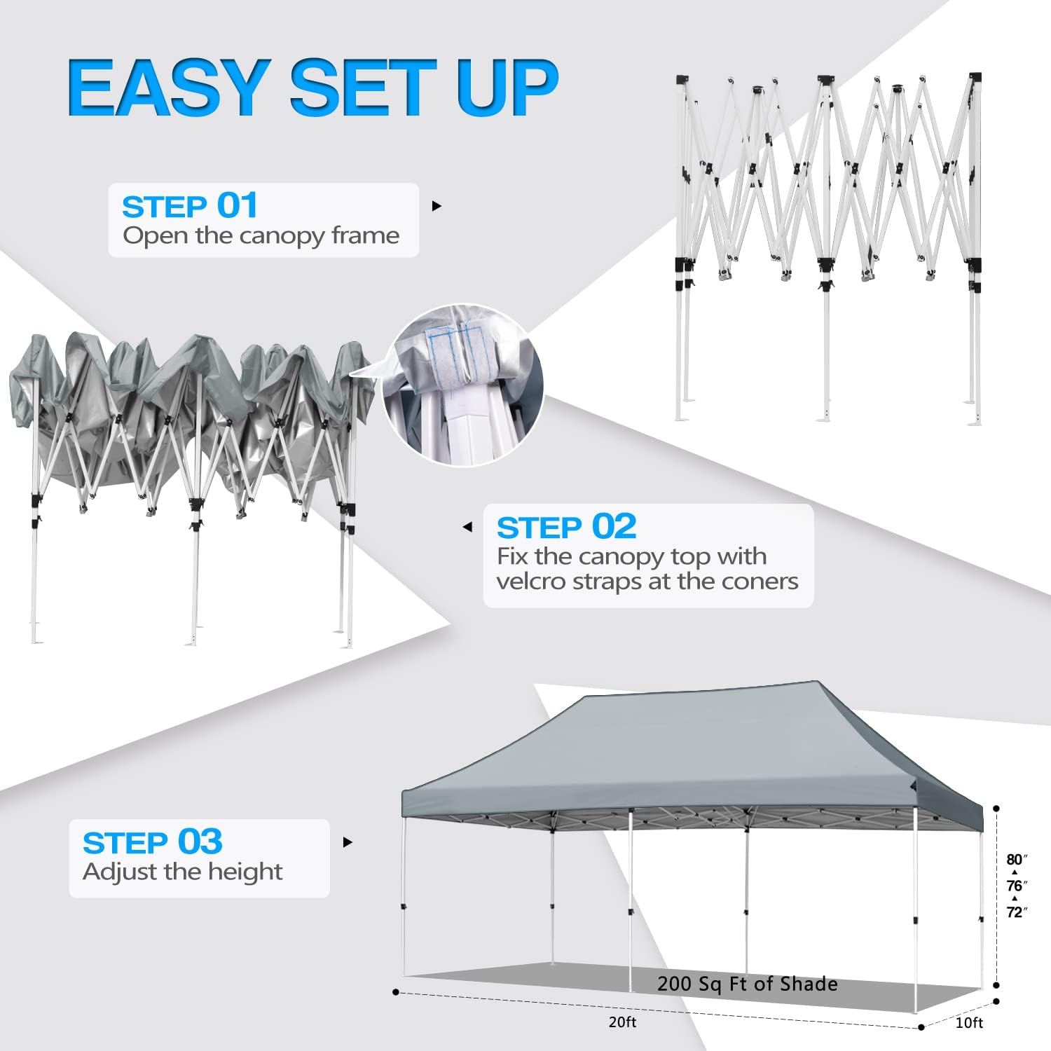 EZ SETUP AND STURDY DESIGN: Our 10×20 pop up canopy tent with collapsible steel frame is easy to set up and fold and can be adjusted to 3 heights from 98” to 106” with the buttons instant. The thickened anti-corrosion steel legs, double-layer fabrics and additional patches at the connection make the camping canopy stronger and sturdier.