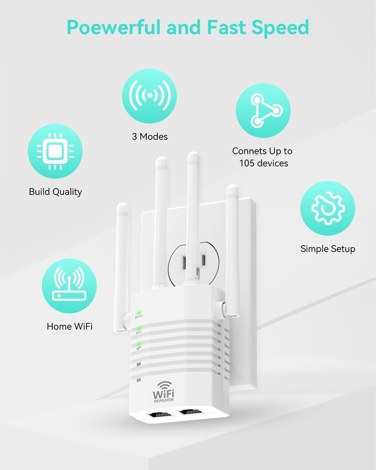 Universal Compatibility: The wifi range extender is compatible with all wifi-enabled devices and routers or access points. It can connect up to 105 devices, such as support for new laptops and IP cameras and more.