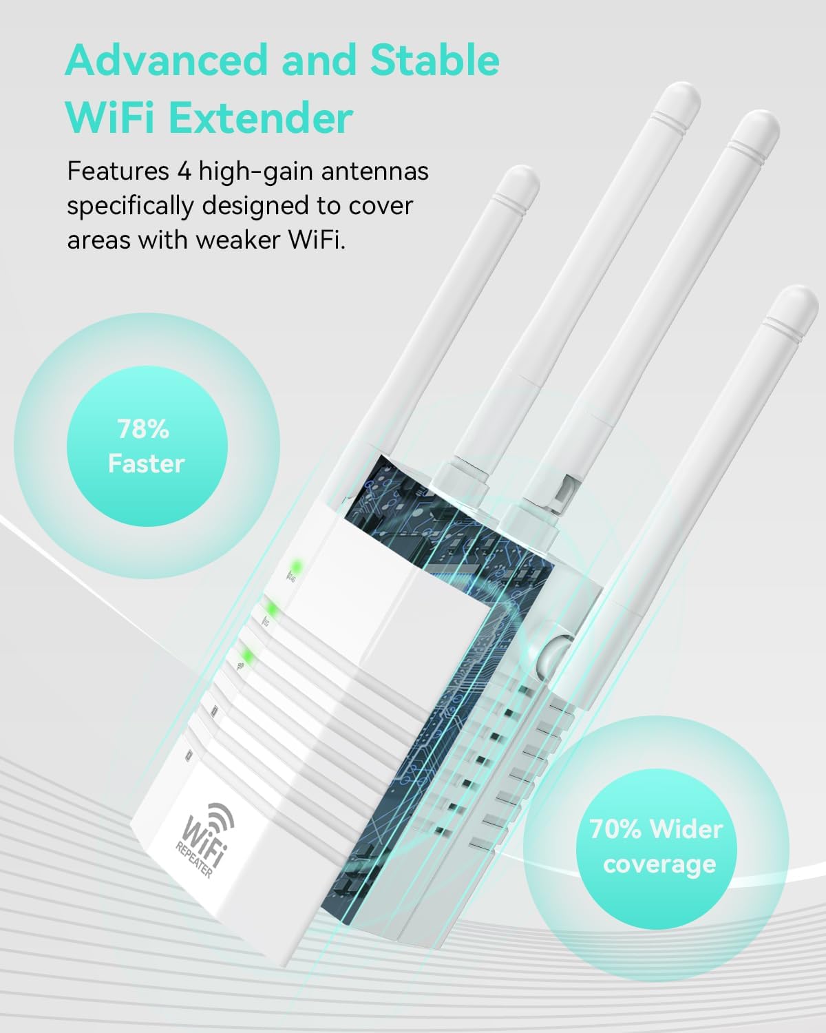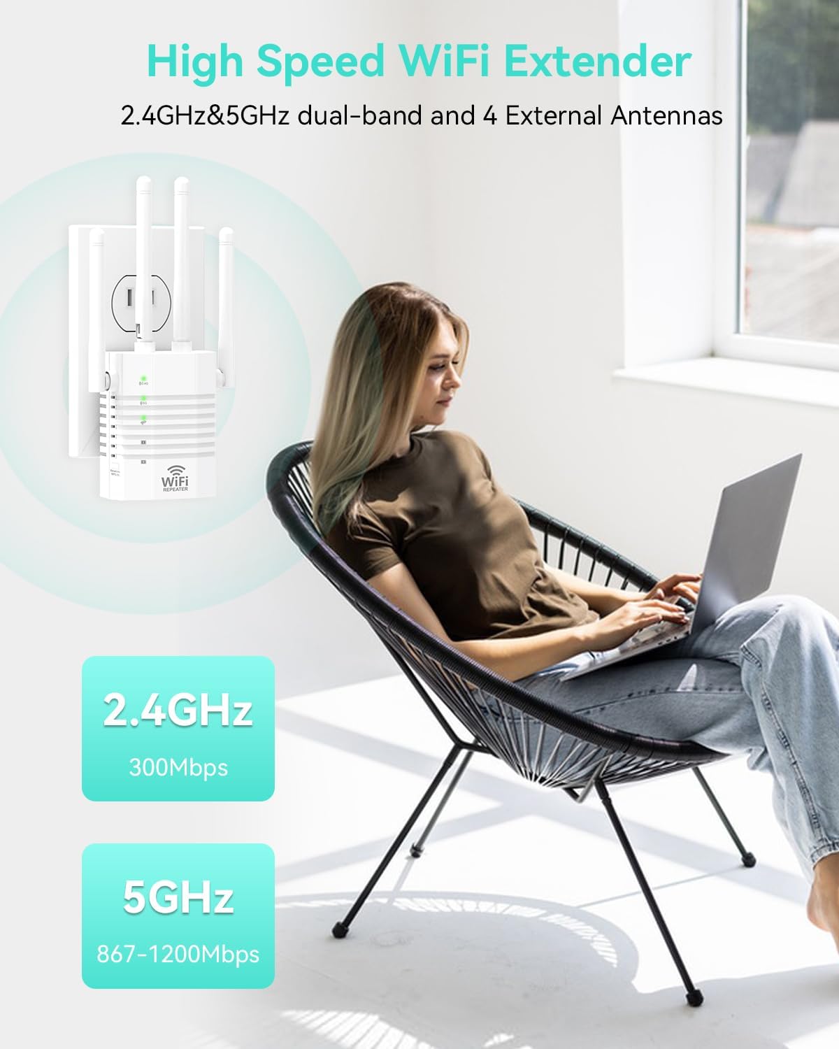 1200Mbps WiFi Extender Dual Band 5GHz/2.4GHz, WiFi Range Extender Covers Up to 12880 Sq. ft & 105 Devices, WiFi Extenders Signal Booster for Home and Outdoor