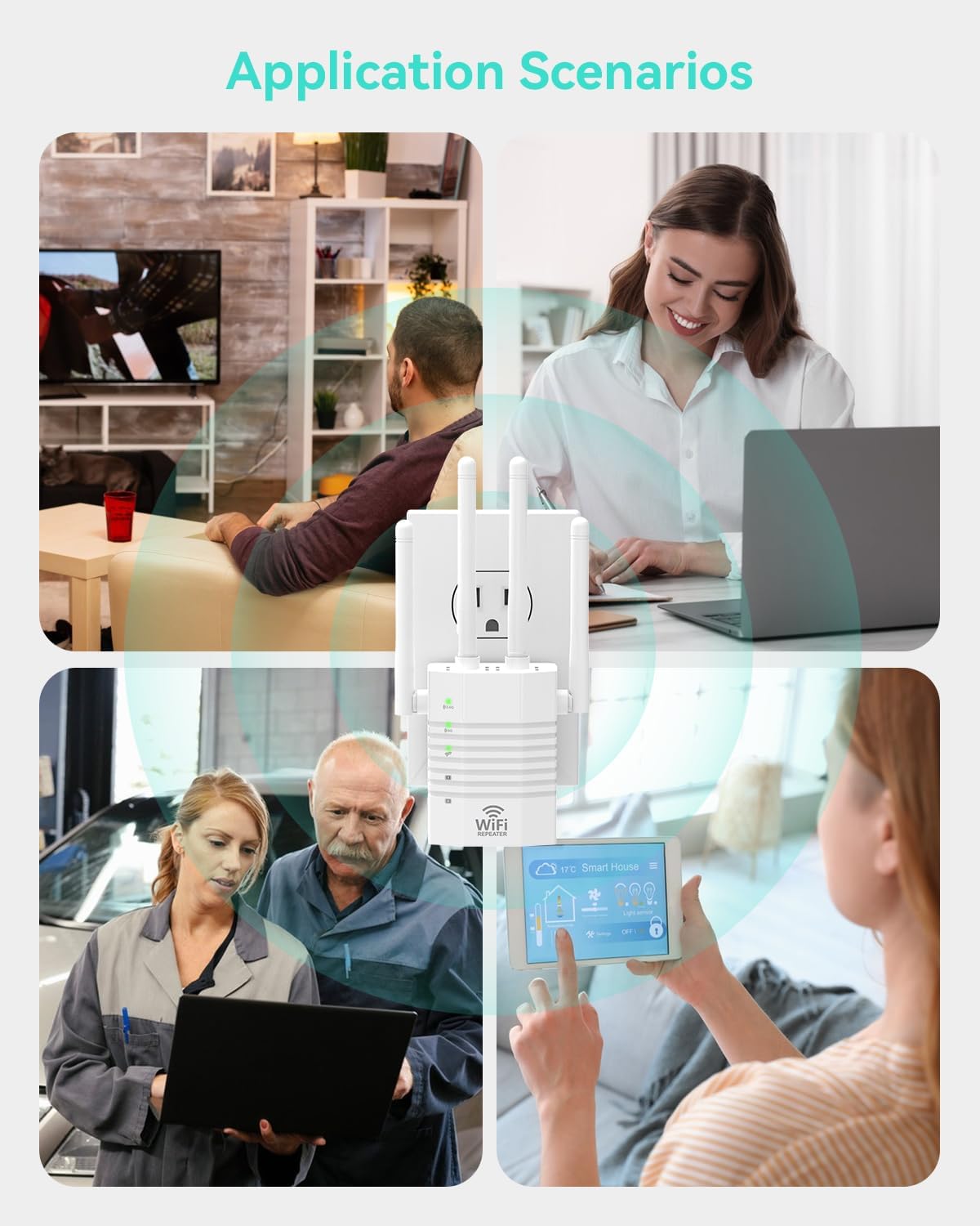 High-Speed and Stable Connection: This wifi extender signal booster for home delivers up to 300Mbps for 2.4GHz and 867-1200Mbps for 5Ghz. The internet extender wifi booster utilizes dual-band technology for wider coverage and provides you with a stable signal. Enjoy surfing the web, watching videos, gaming online, transferring large digital files and streaming videos.