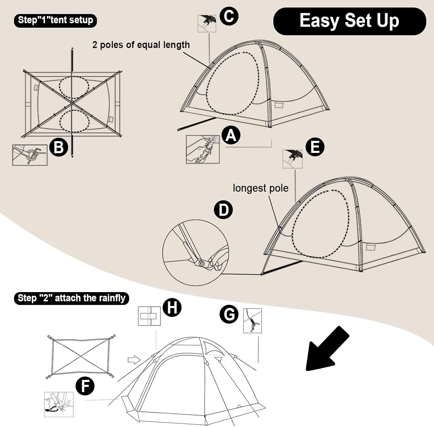 【Sturdy & Freestanding】Designed for extreme weather conditions, our 2 man tent boasts sturdy aluminum poles and secure pegs that provide excellent stability. The 3 crossing aluminum poles construction, along with adjustable wind ropes and seam taping, make this backpacking tent capable of standing up to strong winds. Additionally, the freestanding design allows you to easily move and reposition the camping tent without reassembly, making it perfect for versatile campsite setups.