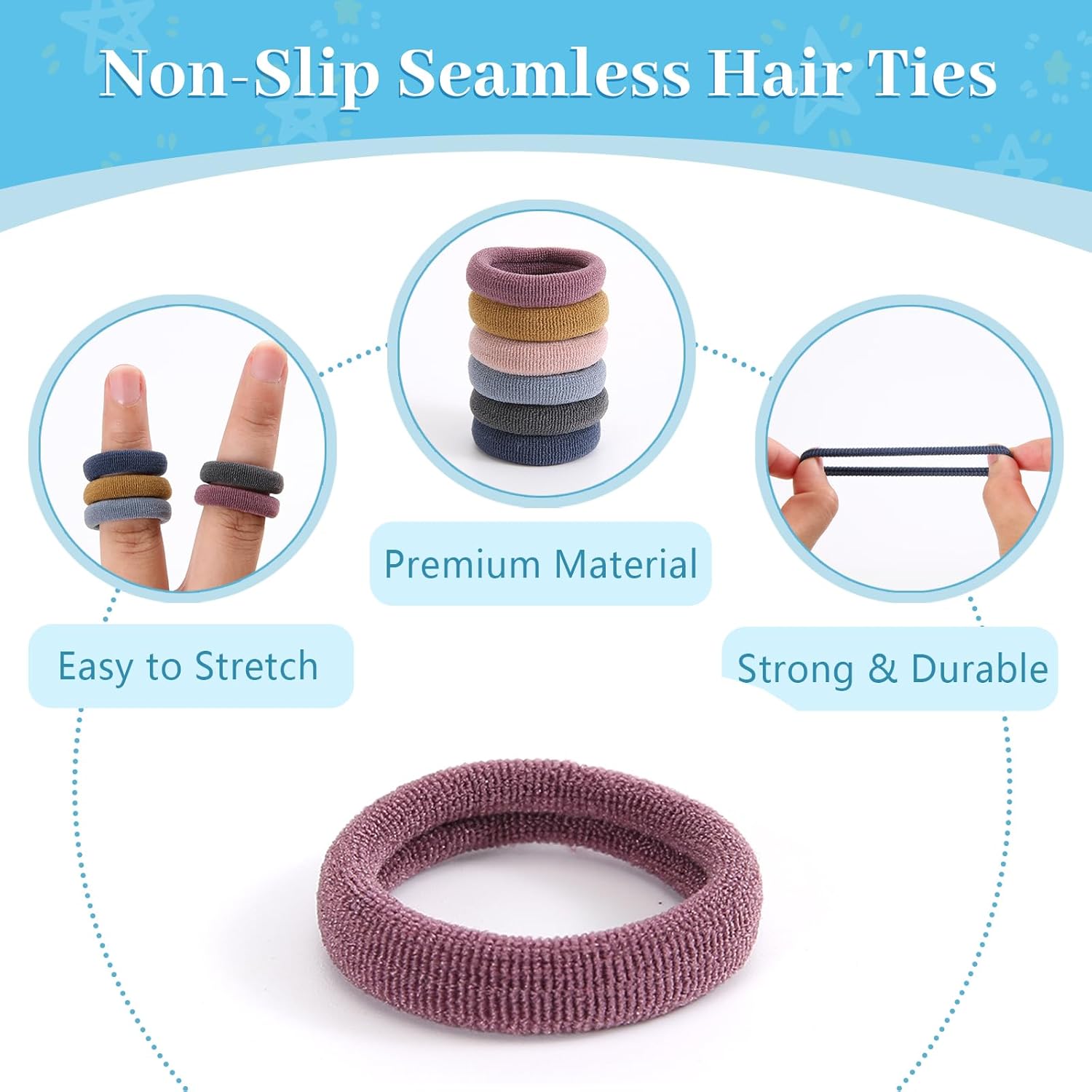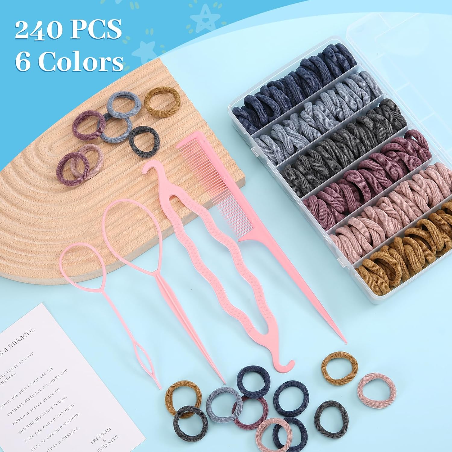 240 Pcs Baby & Toddler Hair Accessories Set – Seamless Soft Cotton Ponytail Holders, 6 Colors with Organizer Box, 4 Loop Styling Tools