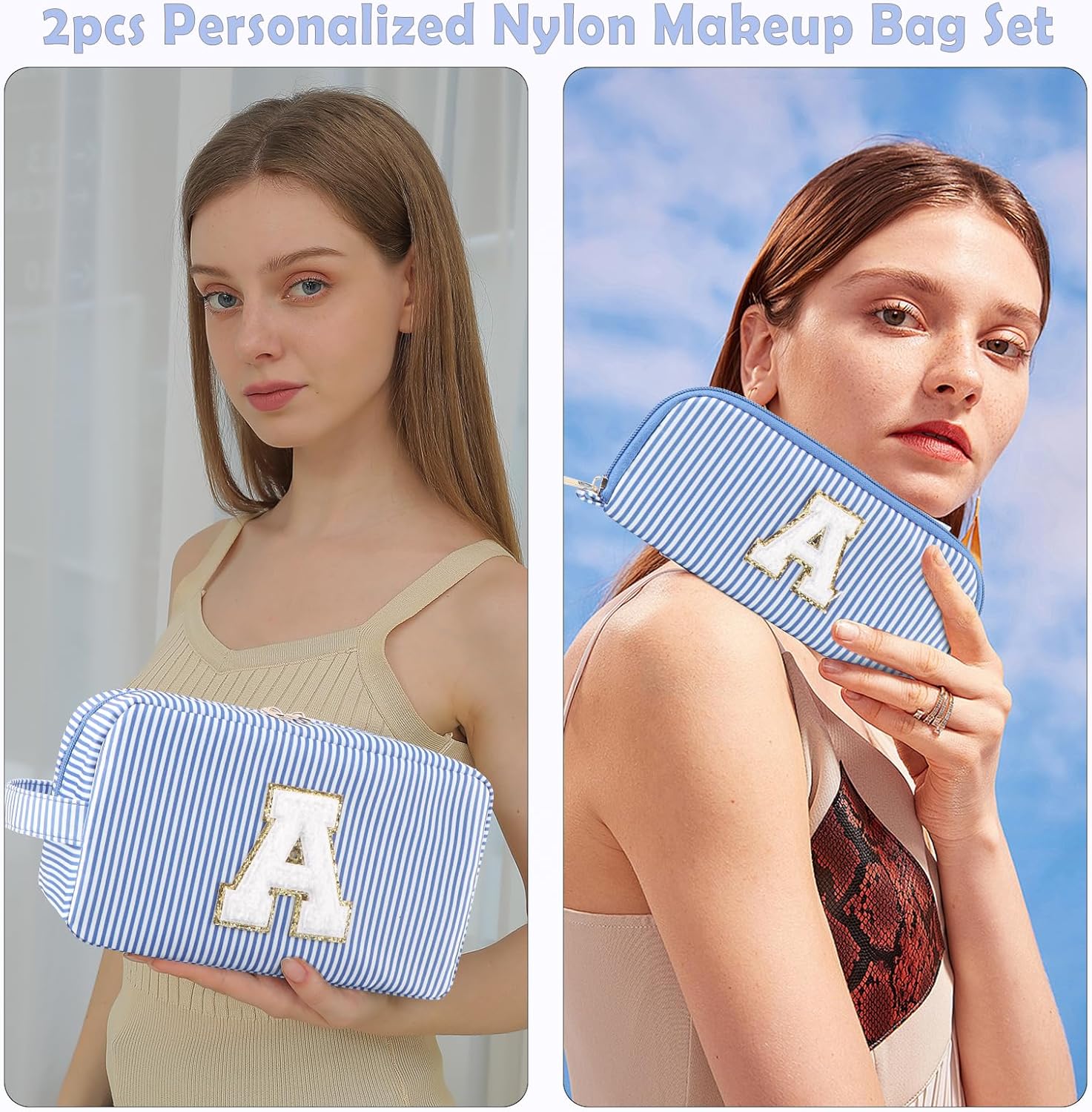 2pcs Makeup Bag Set Spring Break Essentials Monogram Initial Cosmetic and Brush Bag Set Womens Toiletry Bag With Portable Handle and Pockets (StripeBlueSet-A)