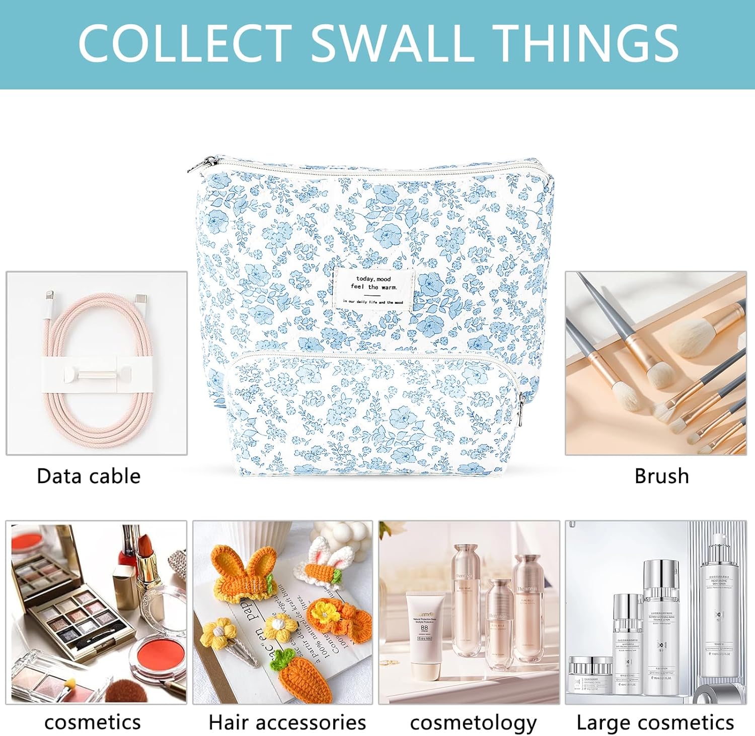 2Pcs Quilted Cotton Makeup Bag Large Travel Makeup Pouch Small Brush Holder Set for Women Floral Coquette Makeup Bag Cute Aesthetic Cosmetic Bag Blue Toiletry Organizer Storage Bag Big Zipper Pouch