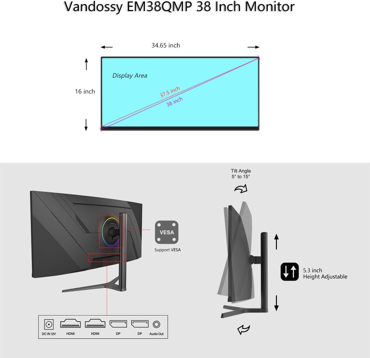 Flexible Connectivity and Versatility: This Vandossy 38inch monitor is equipped with DP*2, HDMI*2, 3.5mm audio jack,which allows you to seamlessly switch between streaming and casual gaming, improving picture clarity and work efficiency.It can be connected to laptops,desktops, Macs(HDMI port required), game consoles(docking station required)and other devices, and can be used as a PC monitor for business office,work design,and entertainment.