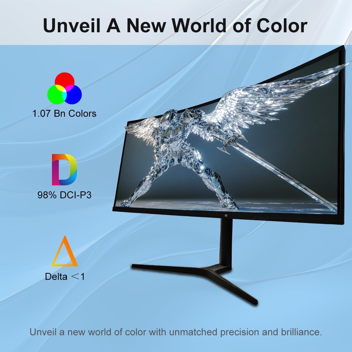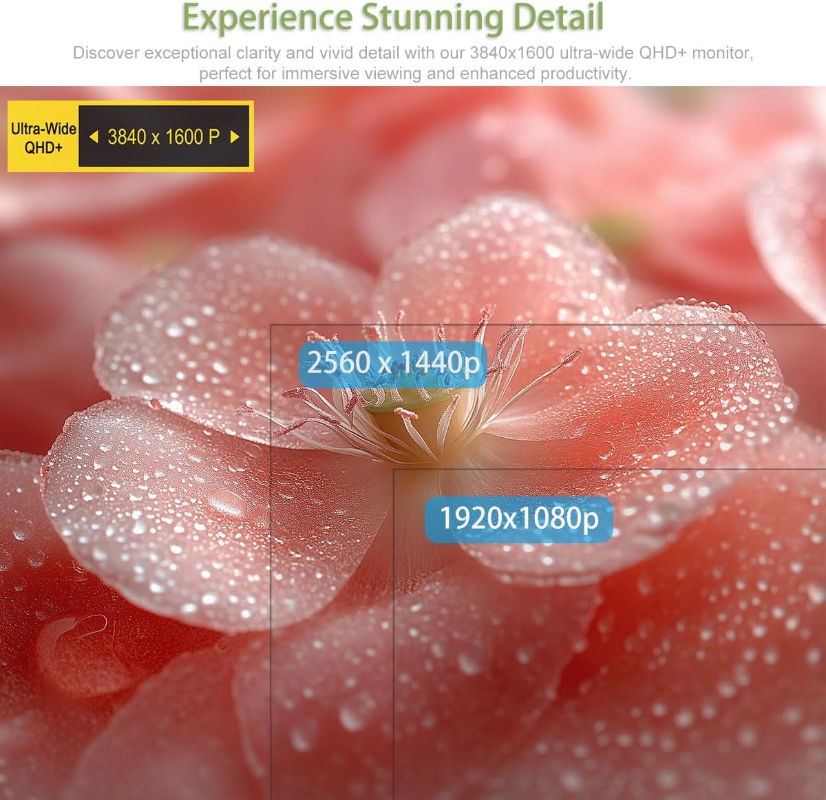 Outstanding IPS Curved Bezel-less UWQHD+ Screen:Featuring UW QHD+ (3840x1600p) resolution, this monitor delivers superior detail and clarity compared to 1080p displays. The IPS panel, complemented by a color LED light ring on the back, provides stable color reproduction and broad viewing angles with support for 1.07 billion colors, enhancing color accuracy and realism. The 2300R Curved Ultra Wide Screen (21:9) expands screen space by 33%, allowing for a clearer view of image details.