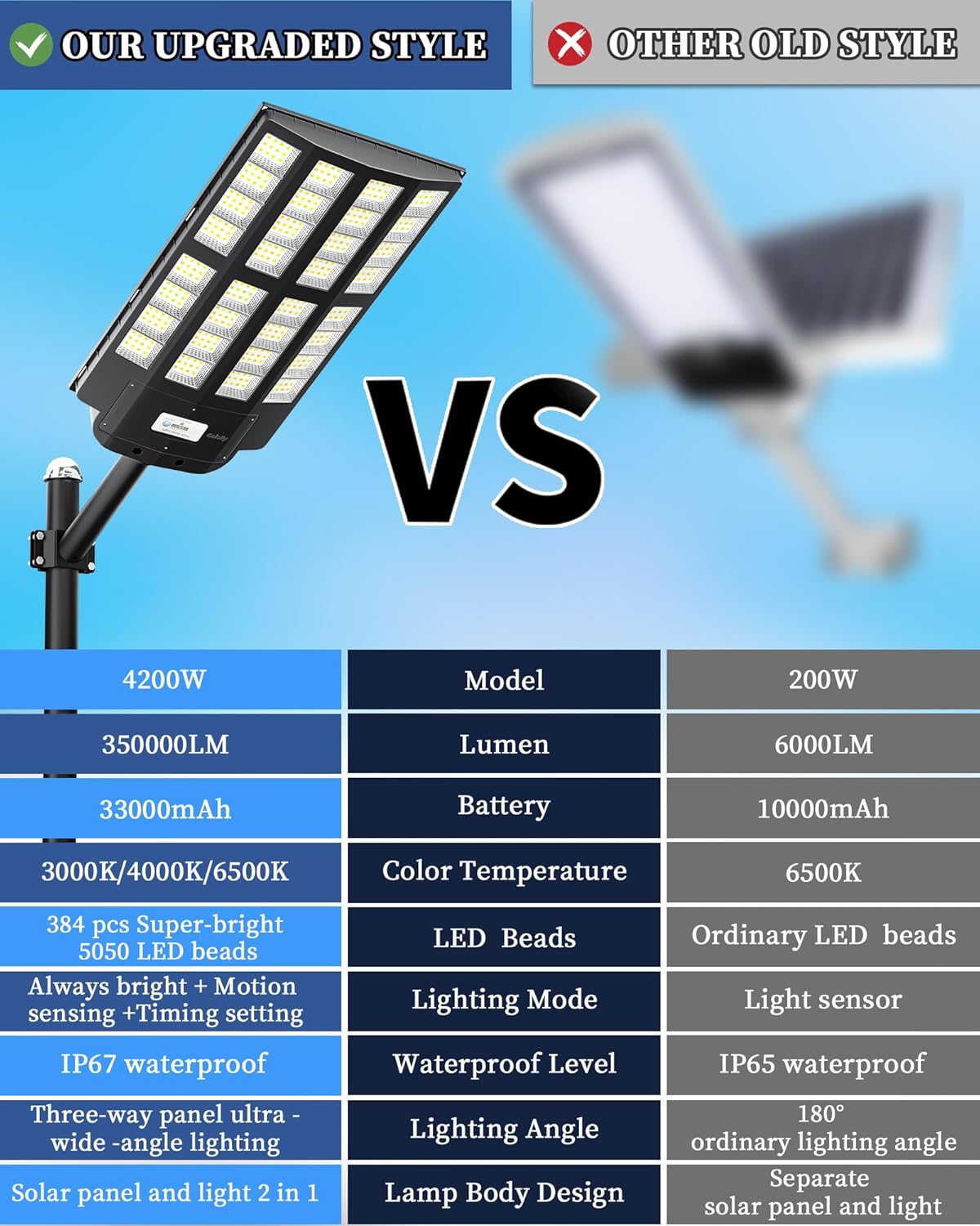【Solar Powered & 0 Electricity Bill】 — Gefolly 4200W solar street light is a built-in 3.2v-33000mAh battery (60,000 hours lifespan), designed with 384pcs 5050 ultra-bright LED lamp beads. IP67, 3000K/4000K/6500K, can work well in bad weather all year. Solar-powered, auto turns on at dusk and charging during the day, no electricity bill. Great choice for commercial and home lighting. Continuous lighting up to 30 hours in dim lighting mode (when fully charged). Note: The remote controls that come with the light are available in white and black. The white and black remote controls are shipped randomly.
