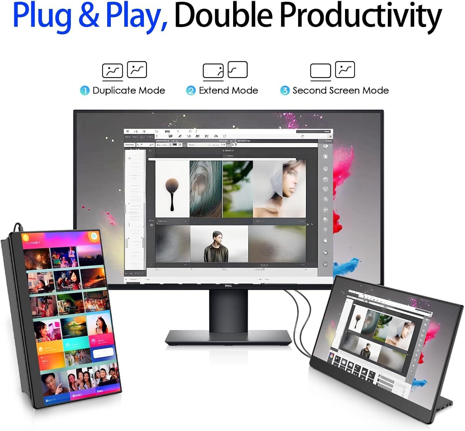 ENHANCED WORK EFFICIENCY-Portable Monitor supports connection via HDMI or TYPEC full-function data cable, enabling screen extension and duplication.During a meeting, use copy mode to share computer content with others. While working,use laptop screen extender mode for increased efficiency. Making tasking more efficient and easy with multiple display modes: copy mode/extended mode/second screen mode.