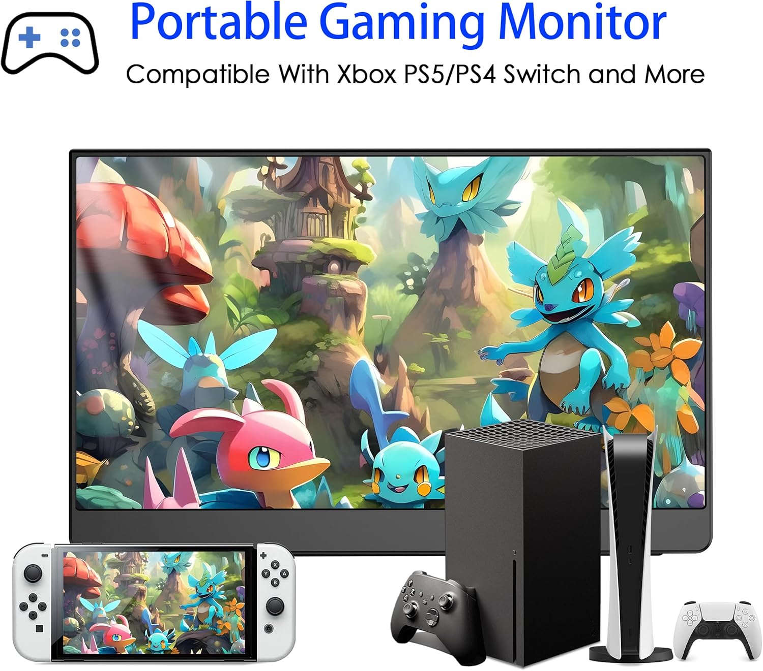 PLUG AND PLAY&BROAD COMPATIBILITY-The portable monitor for laptop features 2 USB Type-C ports and a Mini-HDMI port for easy access to most devices with just one USB Type-C or MINI HDMI cable.NOTE: Your device must support Thunderbolt 3.0/4.0 or USB 3.1 Type C DP ALT-MODE. Is compatible with all devices equipped with mini HDMI or USB Type-C data ports, such as laptops, PCs, smartphones, XBOX, SWITCH, PS4, 5, etc.