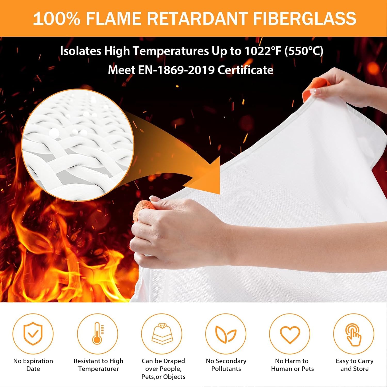 🔥【PREMIUM FIREPROOF MATERIAL】Fire blanket is designed with 100% quality flame retardant fiberglass, which can isolate high temperatures up to 1022°F (550°C). They conform to CE safety standards (EN 1896:1997). The tabs with special flame retardant treatment, compared with other fire blankets with nylon tabs in the market will burn under the heat source, our fire retardant tabs are not affected by high temperature, safer to use.