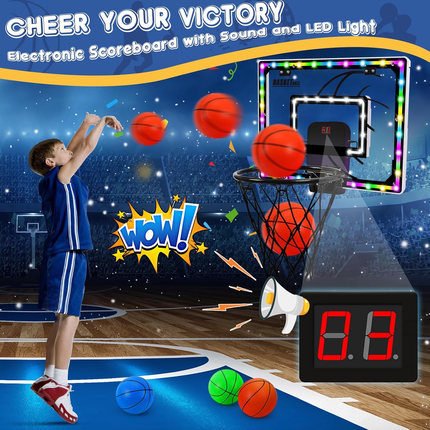 🏀【IDEAL GIFT FOR KIDS】: Indoor basketball hoop set with light and scorer is a perfect birthday or Christmas gift for kids and adults especially basketball fans. It keeps kids away from the electronics and love sports. Basketball games enables your kids to learn more about perseverance, compete and cooperate. Adults can also have a rest from busy work and keep away from sub-health.