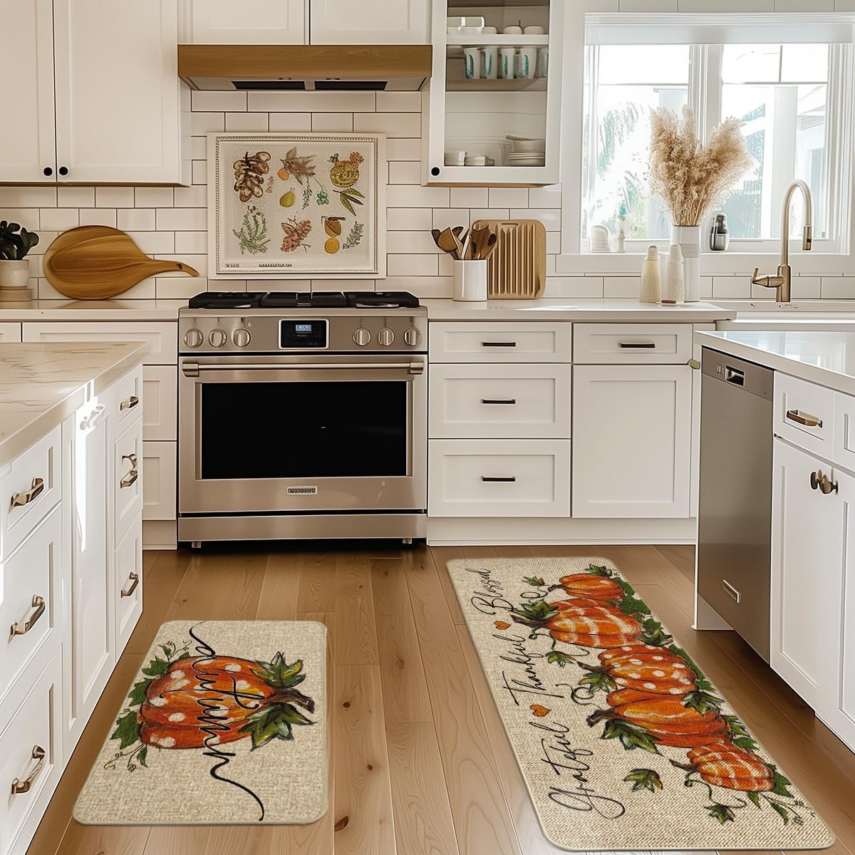 Artoid Mode Orange Polka Dot Pumpkin Maple Leaf Fall Kitchen Mats Set of 2, Thanksgiving Home Decor Low-Profile Kitchen Rugs for Floor – 17×29 and 17×47 Inch