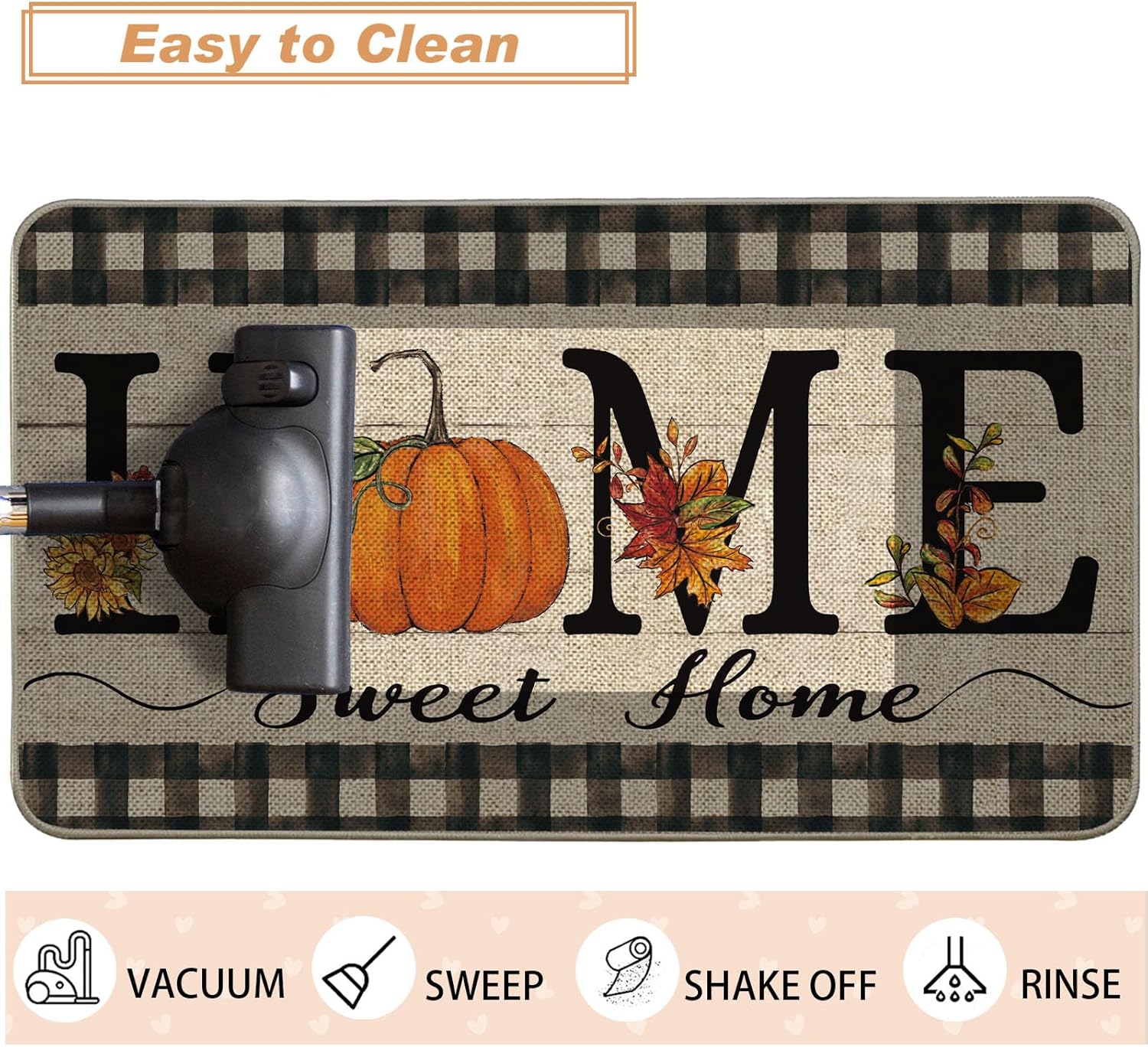 Resist All Weather And Easy To Clean: The fall Home Sweet Home door mat can hold the damage of rain and snow outside the door. It can be clean is super easy, Just tap the door mat, shake the dirt off and hose it off. Vacuum is also OK. No complicated wash process again