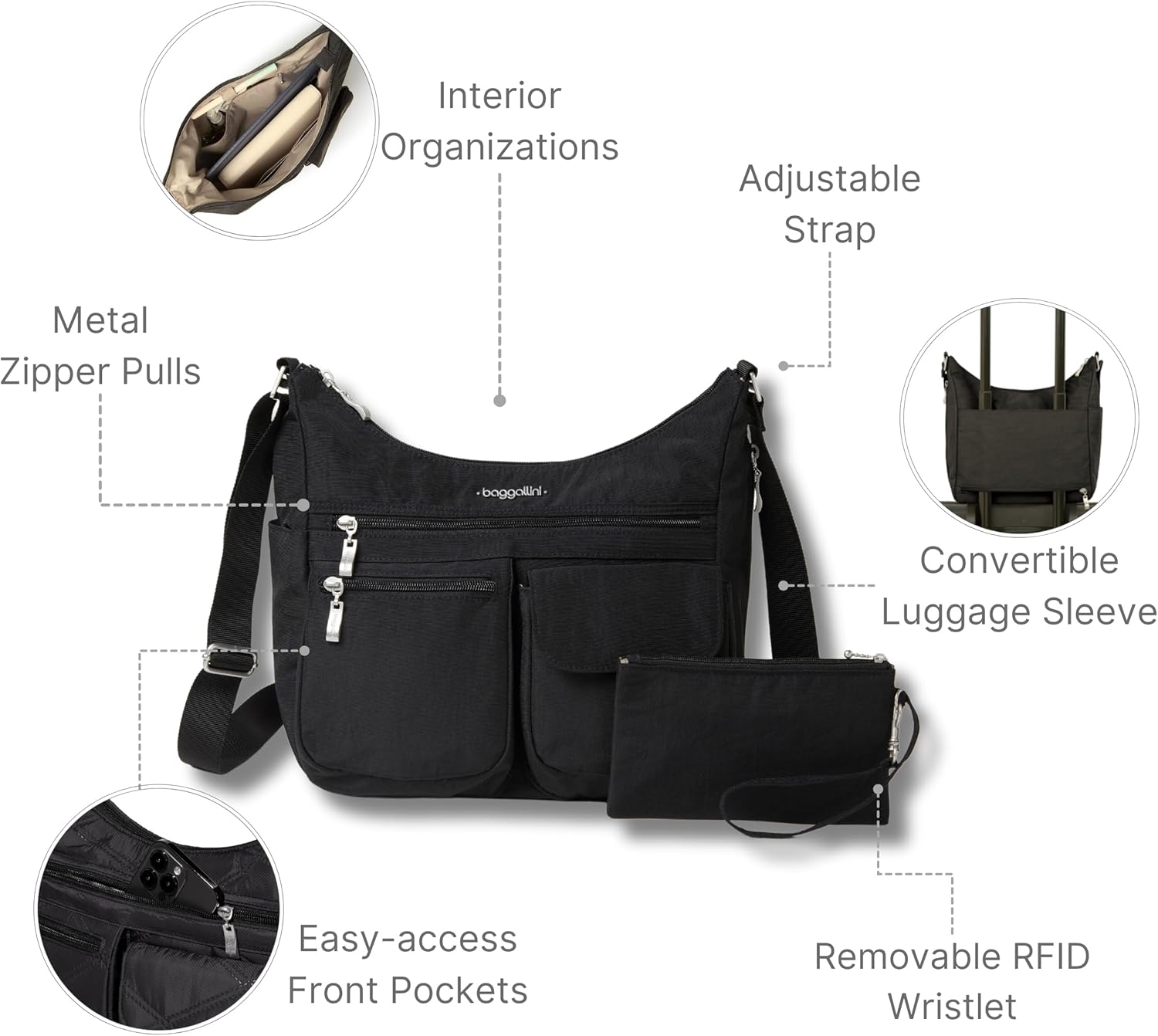 Baggallini Everywhere Bagg Crossbody Women 11×9 Lightweight Nylon Hobo Water-Resistant Travel Bag W/RFID Protection