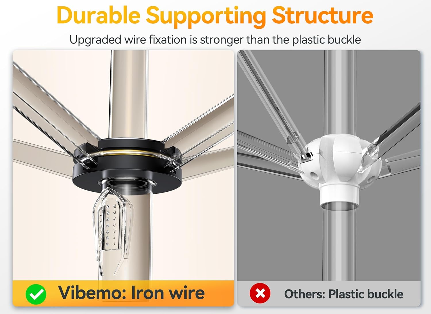 Reinforced Supporting Structure: The Vibemo beach canopy structure is sustained by robust, lasting iron wires compared to the fragile plastic buckle structure, making the cabana more steady.