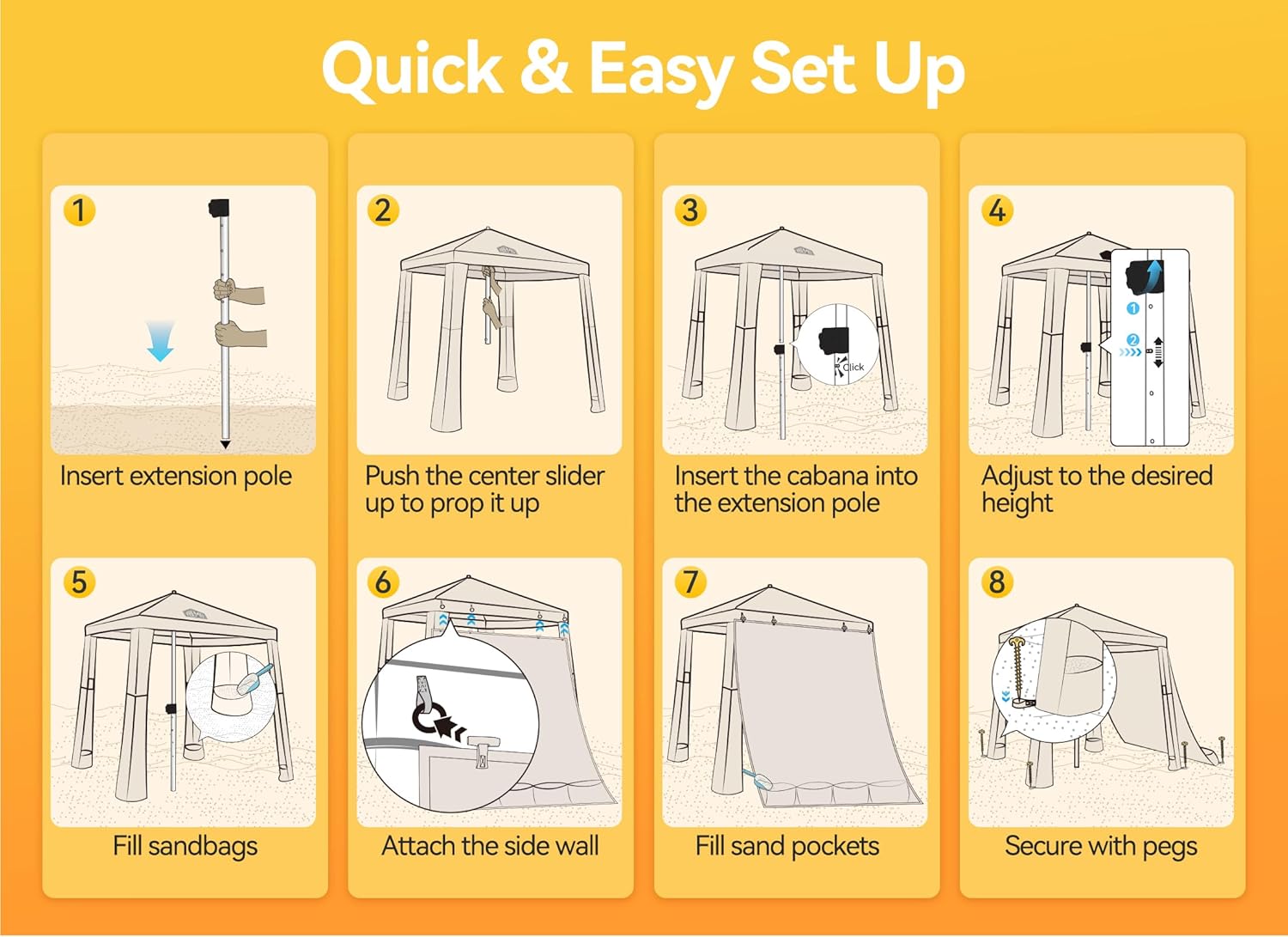Quick and Easy Setup: One person can set up a Vibemo cool beach cabana tent in 3 minutes since it is as easy as opening a beach umbrella. Placing the extension poles vertically, and rotate the pole into the sand deeply to ensure a more stable cabana.
