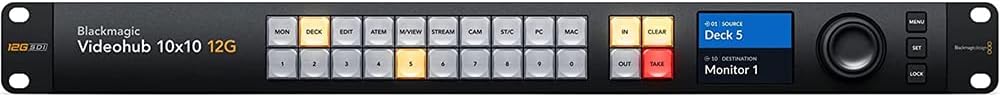 Blackmagic Videohub 10×10 12G is an advanced zero-latency video router that supports any combination of SD, HD and Ultra HD on the router at the same time. It has 10 12G-SDI inputs and 10 12G-SDI outputs plus reference connections in one rack unit size. The front panel LCD screen allows you to view video before routing and clearly displays routing labels and video standards. Routing can be done by direct button selection and using the large rotary knob control that has an electronic clutch. It also features SDI clocking, external Ethernet control and supports all SDI video standards up to 2160p60. Featuring Pearstone’s Snagless Cat 6a patch cable as it comes rated at 550 MHz and is capable of transmission speeds of up to 10 Gb/s. In addition to a standard 6 foot PC power cable from Comprehensive it is a replacement power cable for your PC, monitor, printer, scanner and almost any other device that uses the 3-pin shroud power connector. Also with a 5-pack of Kellards Cleaning Wipes. The box contains Blackmagic Design Videohub 10×10 12G Zero Latency Video Router. 1 Videohub software. Pearstone – Cat 6a Snagless Patch Cable (25 Feet, Black). 1 x CAT6-A25B Patch Cable. Complete PC Power Cable – 6. 1 x 6 foot polycarbonate cable. Kellards Cleaning Wipes. 1 pack of 5 SC-P105 wipes.