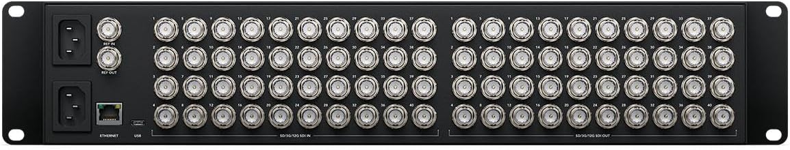 Zero latency 12G-SDI supports SD, HD and Ultra HD up to 2160p60. Built in control panel with direct entry buttons and spin knob control. LCD monitor with live video and labels for visual routing. SDI re-clocking on all 12G-SDI inputs. Works with Videohub Master Control Pro and Videohub Smart Control Pro control panels. Supports Videohub Software Control for Mac, Windows and iPad. Includes free SDK for integration into broadcast automation systems. Ethernet for remote control from external hardware or software control panels. Localized for 13 popular languages.