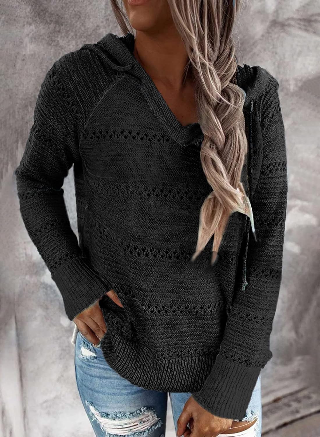 Boutique Clothing Women Knitted Hoodies Black Hooded Sweater Hollow Out Knitted Hooded Sweater