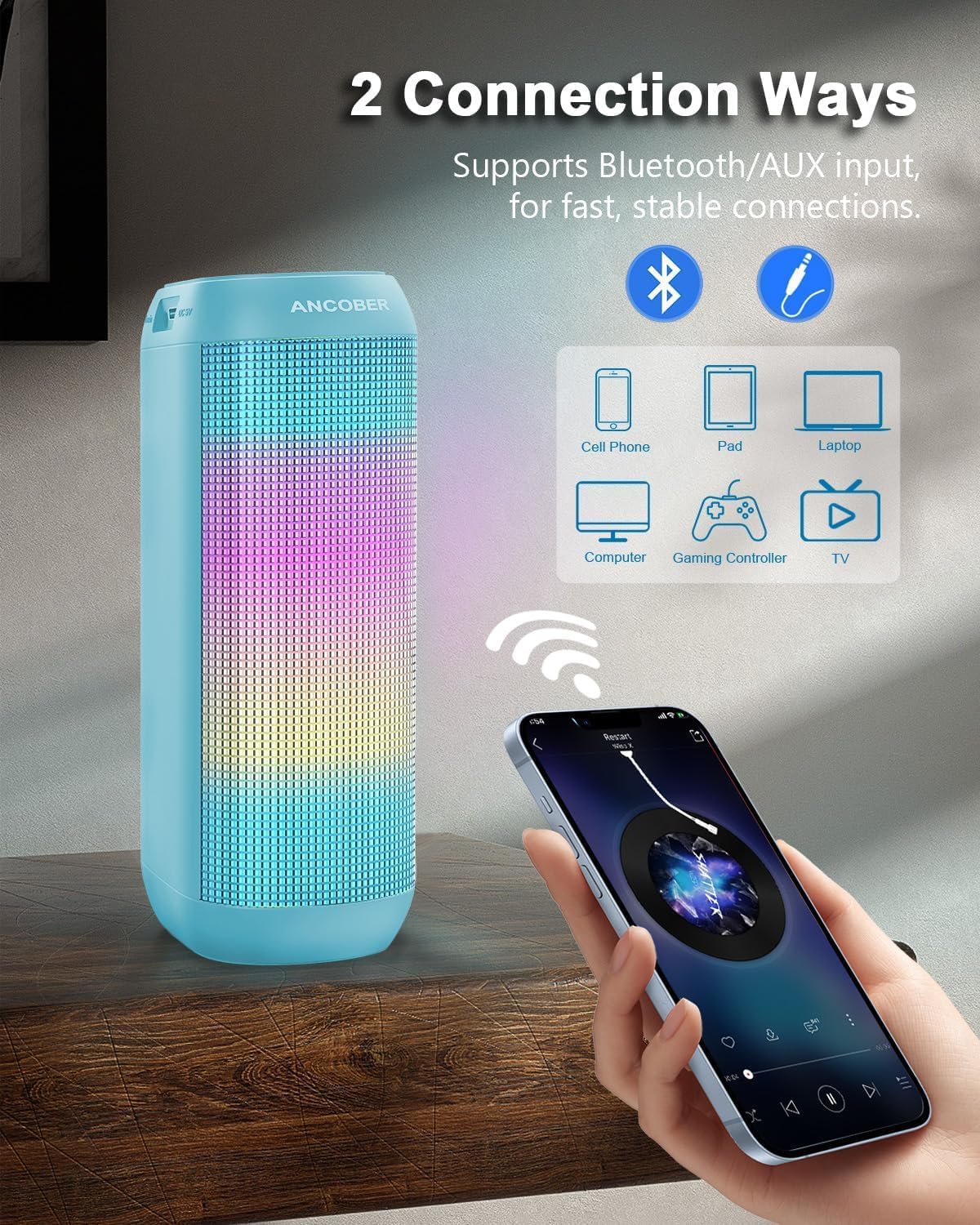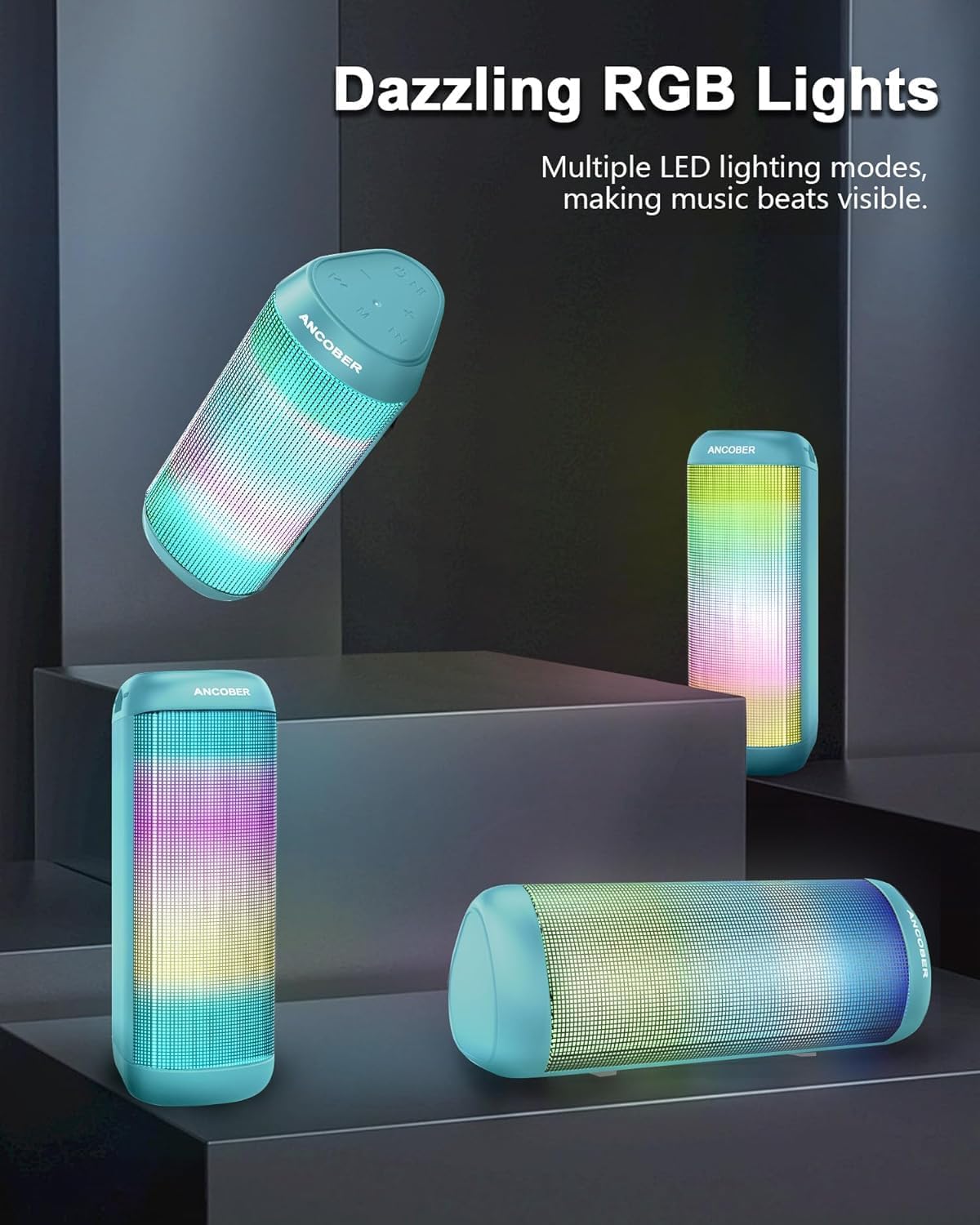 ANCOBER LED light Wireless Bluetooth Speakers designed multi universal frequency dynamic light modes and 2 beating music lighting modes to suit your needs for different occasion atmospheres. (The higher the volume, the more obvious the lighting effect of these ) You can also turn off the LED lights.