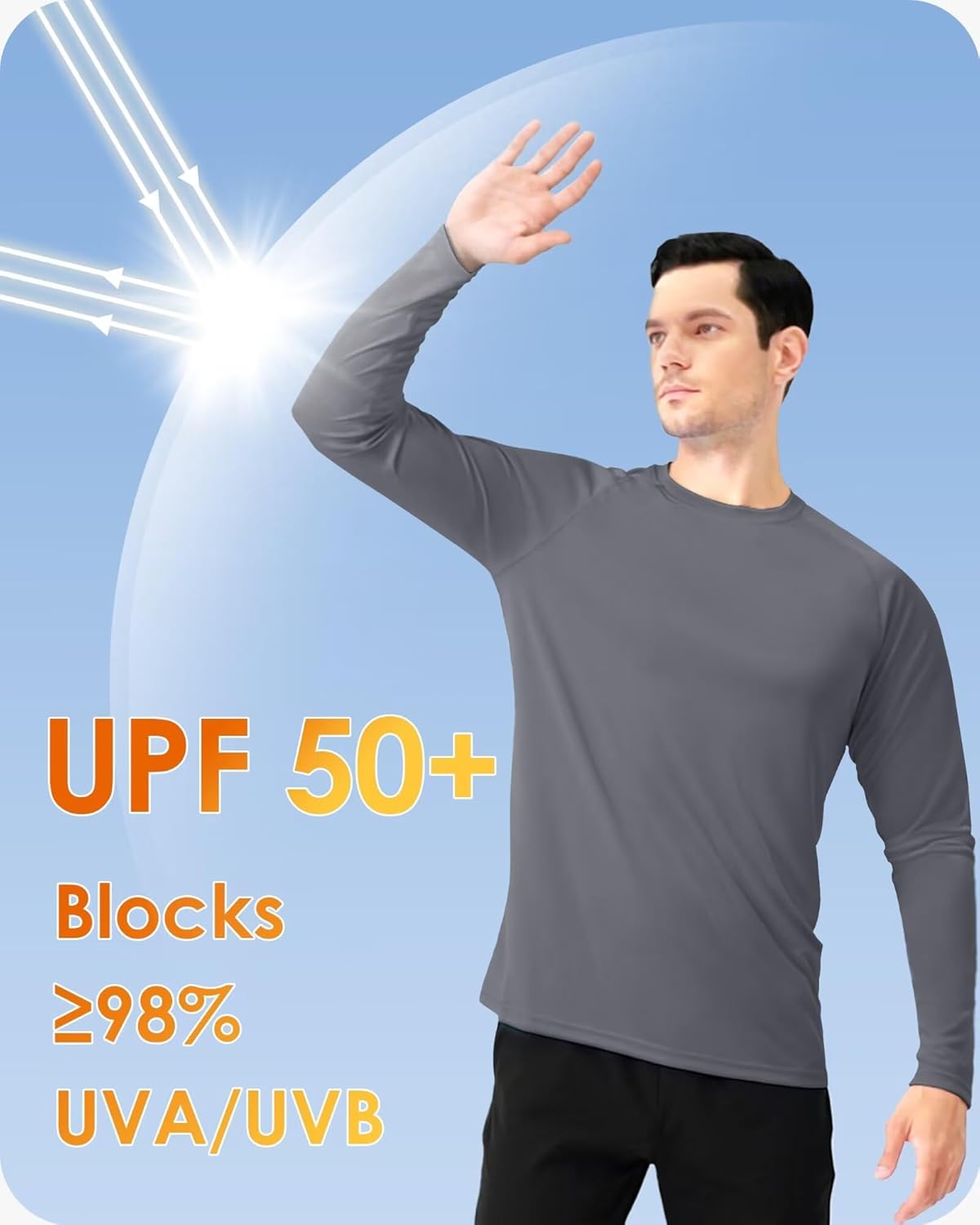 UPF 50+ means that less than 1/50th of the sun’s UV radiation passes through the fabric, reducing your skin’s exposure to UVA/UVB rays by 98%.
