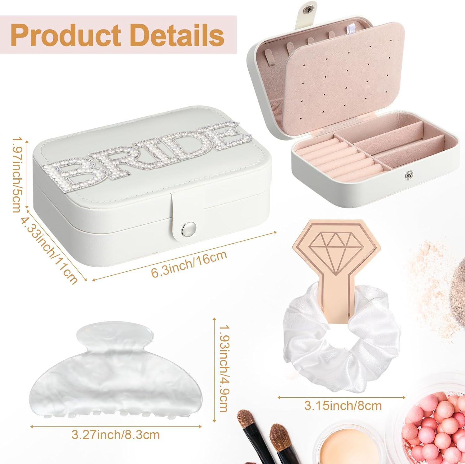 Comprehensive Package: the package include 1 piece of wedding bride cosmetic bag, 1 piece of bride jewelry case, 1 piece of hair clip, 1 piece of hair scrunchie, and 2 sets of BRIDE embroidered letters( DIY accessories) which caters to various needs, making it an ideal gift for brides