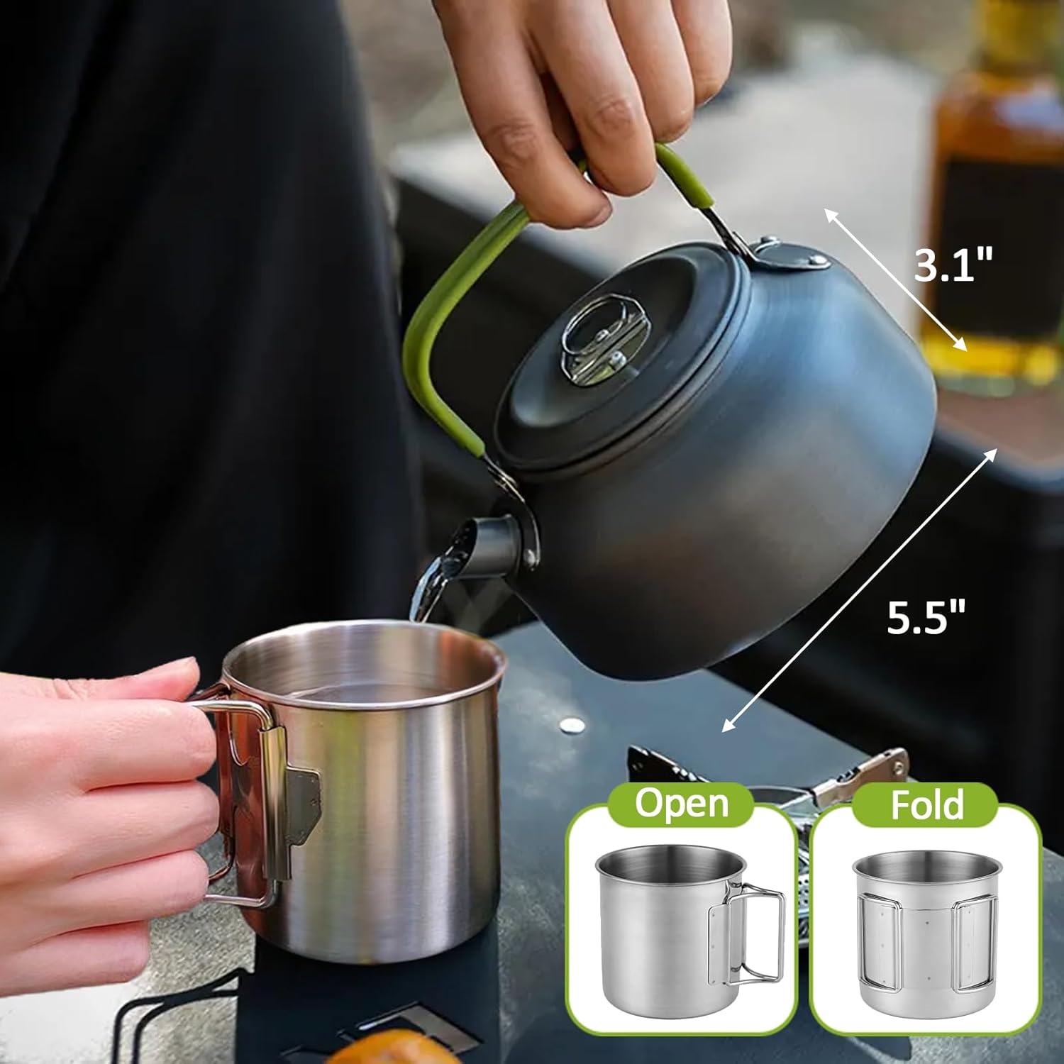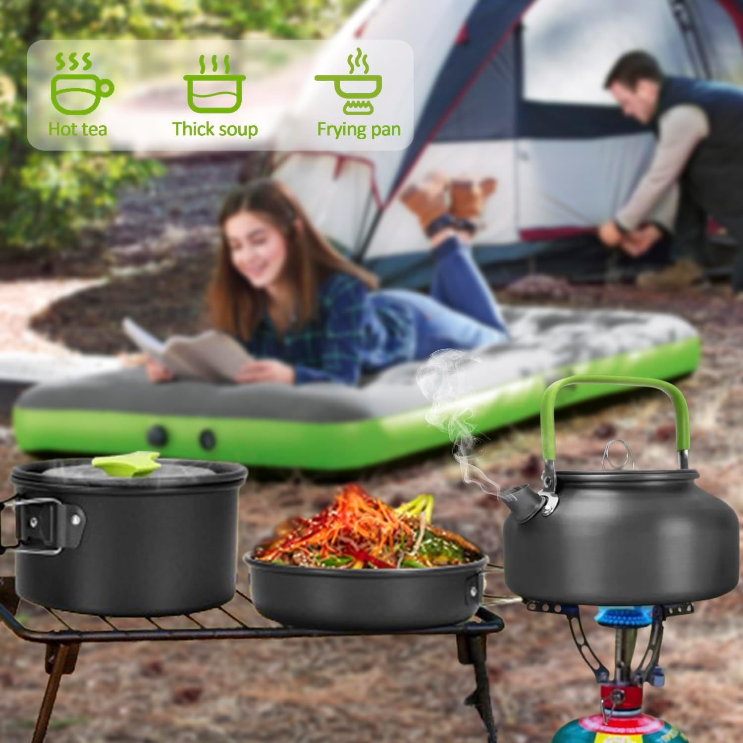 1-2 PERSON CAMPING COOKWARE: This camping kitchen set is perfect for camping, hiking, backpacking, or small-scale cooking in the garden. Whether you’re adventuring solo or with companions, this cooking set has got you covered
