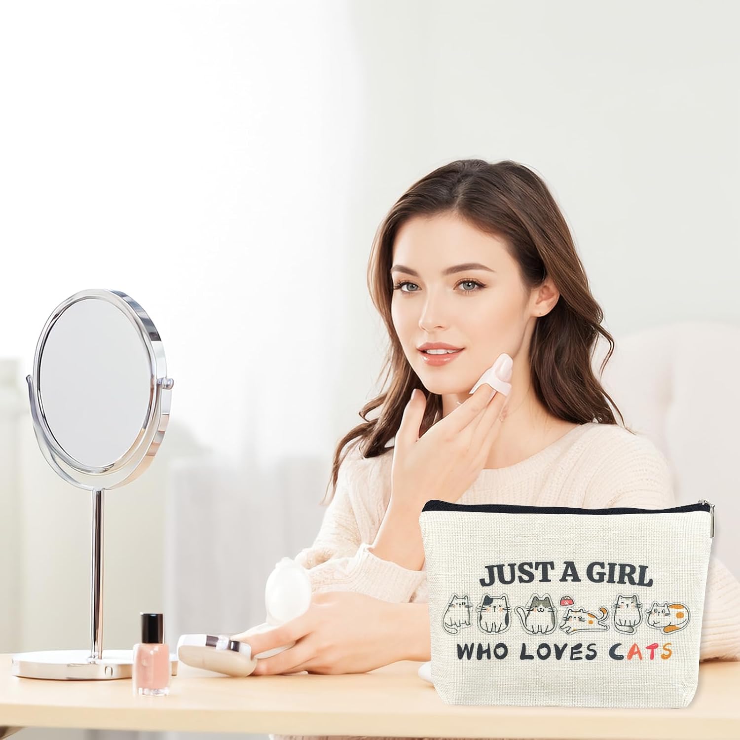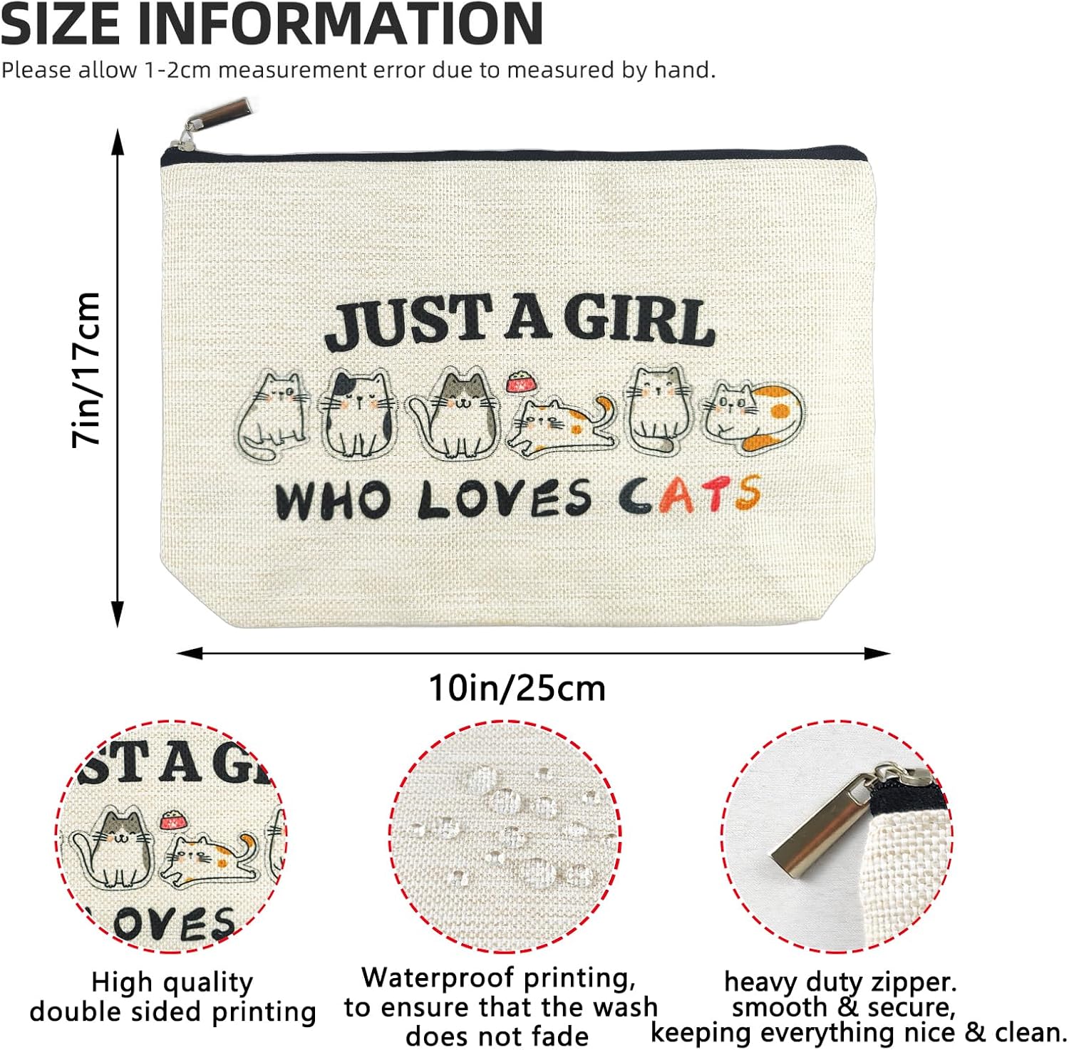 【”Just A Girl Who Loves Cats” Makeup Bag】: This makeup bag is a good blend of practicality and style. It’s a double-sided, 100% linen bag featuring an adorable, cat-themed design – making it an ideal cat lover gift for women. A fusion of durability and fashion, this makeup bag highlights a high-quality silver zipper that ensures lasting performance.