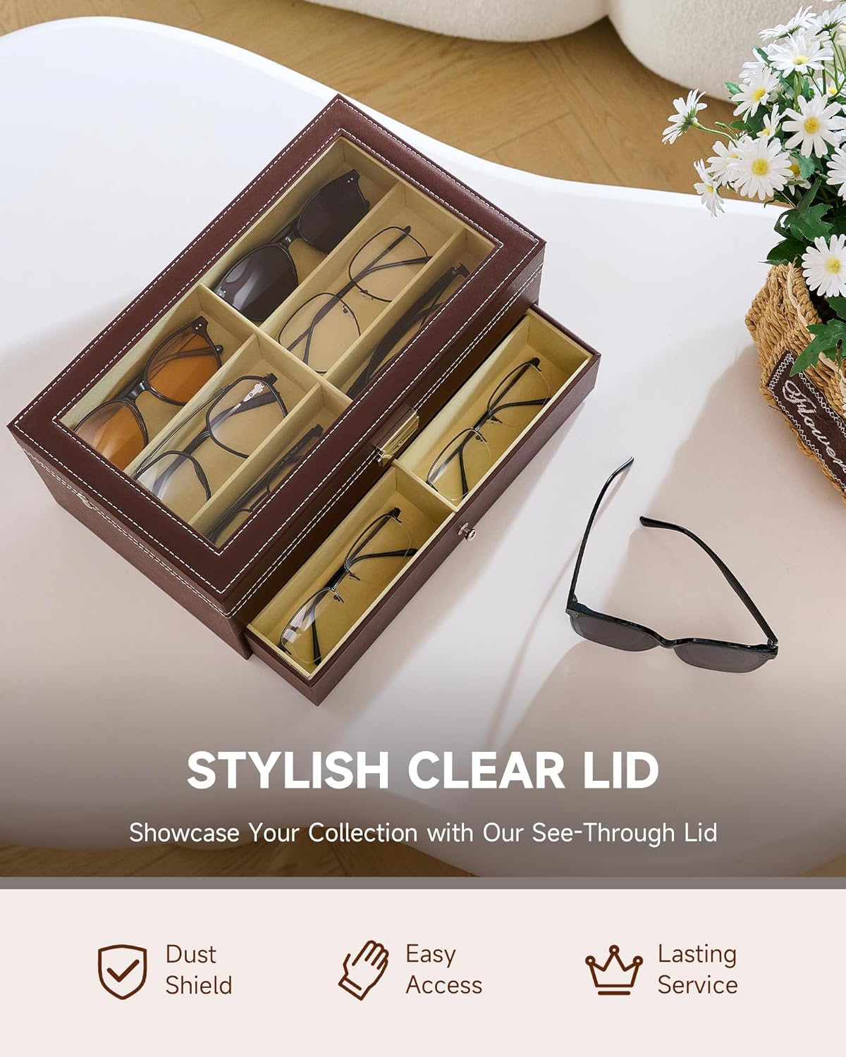 Easier to Pick A Style: Say goodbye to searching through drawers or shelves. The clear glass lid allows you to easily view and access your sunglasses, making it convenient to find the perfect pair for any occasion.