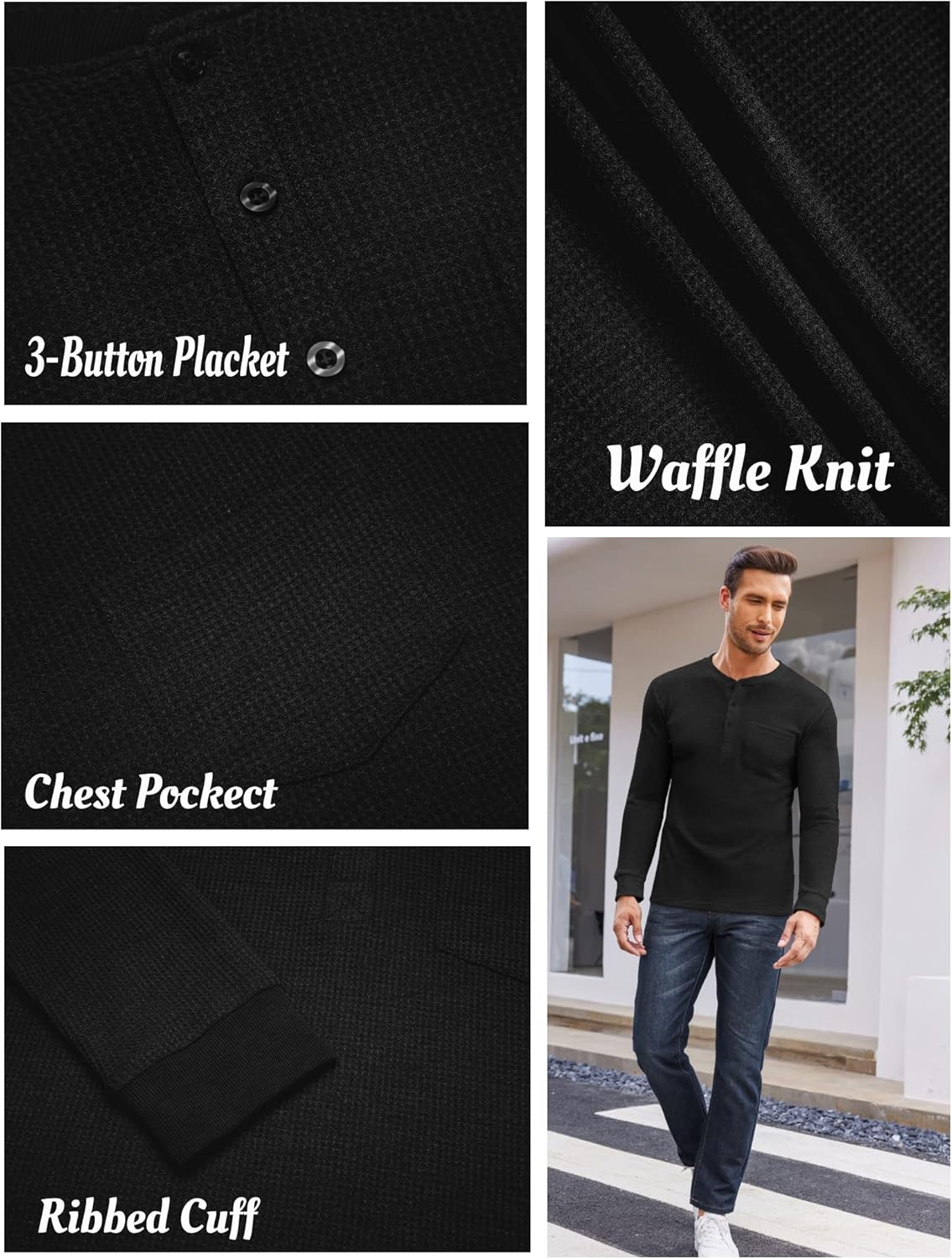 COOFANDY Men’s Henley Shirts Long Sleeve Basic Waffle Pique Pullover T-Shirt with Pocket