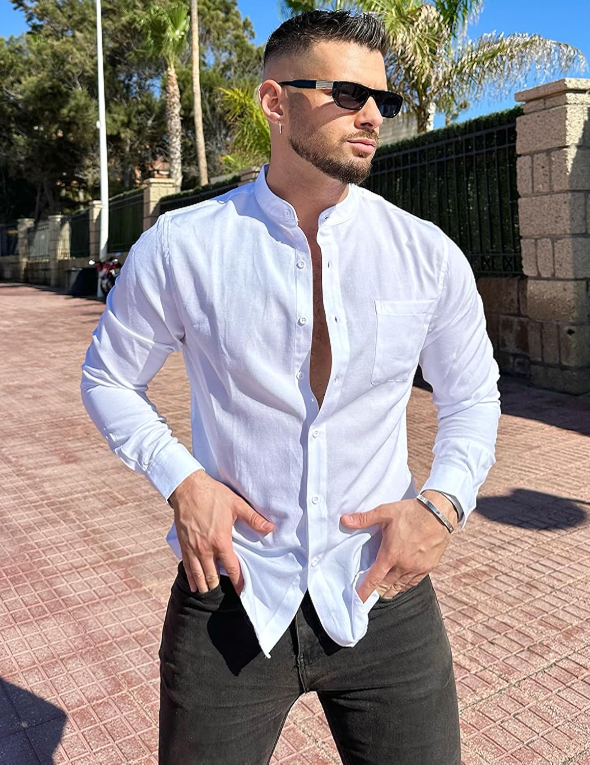 Mens Fashion Mandarin Collar Shirt Long Sleeve Button Up Shirt