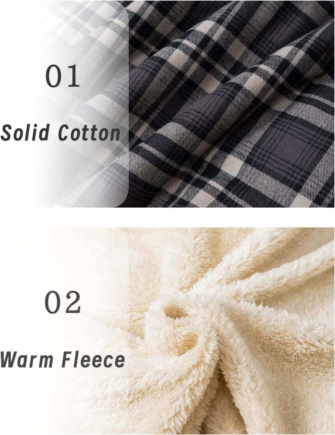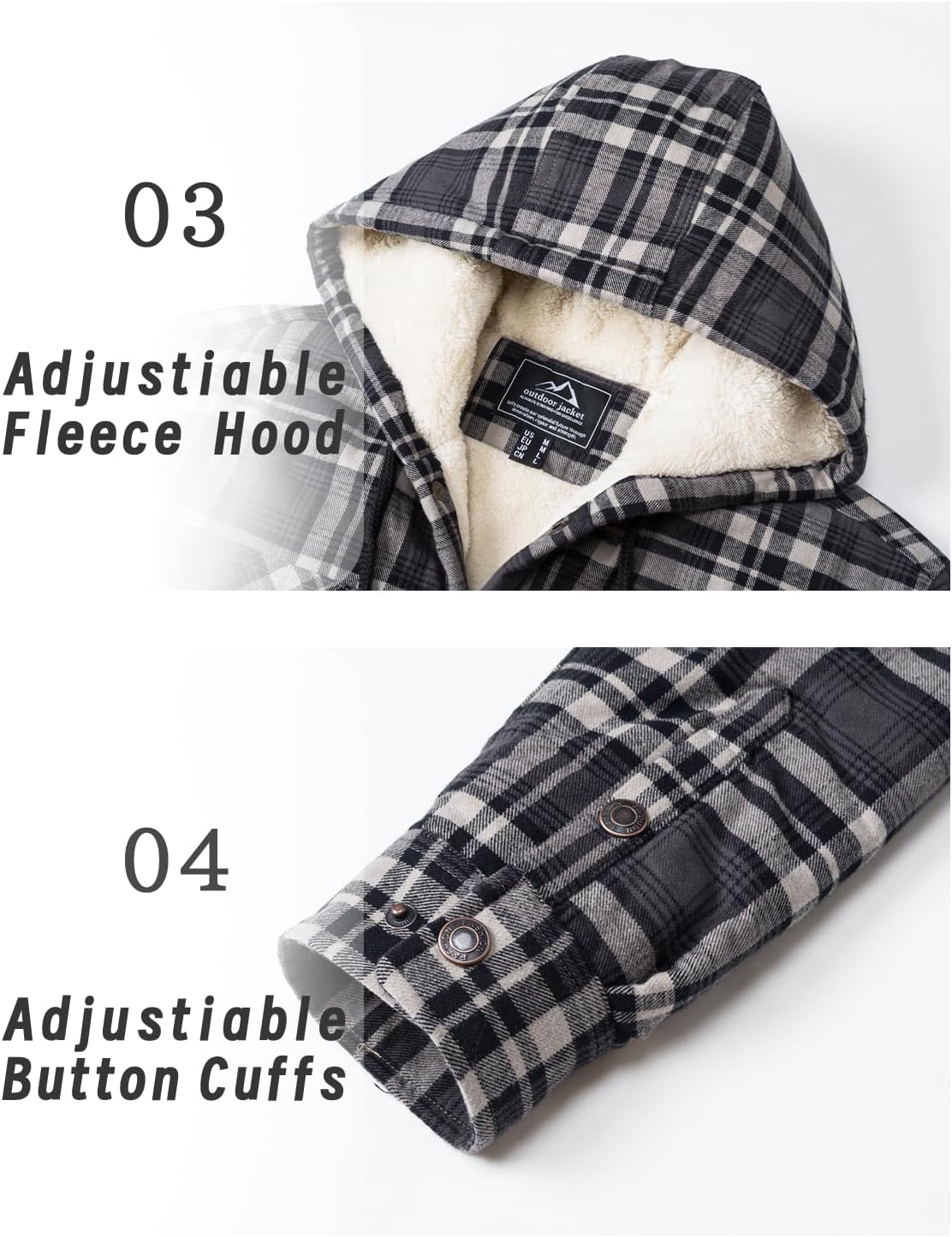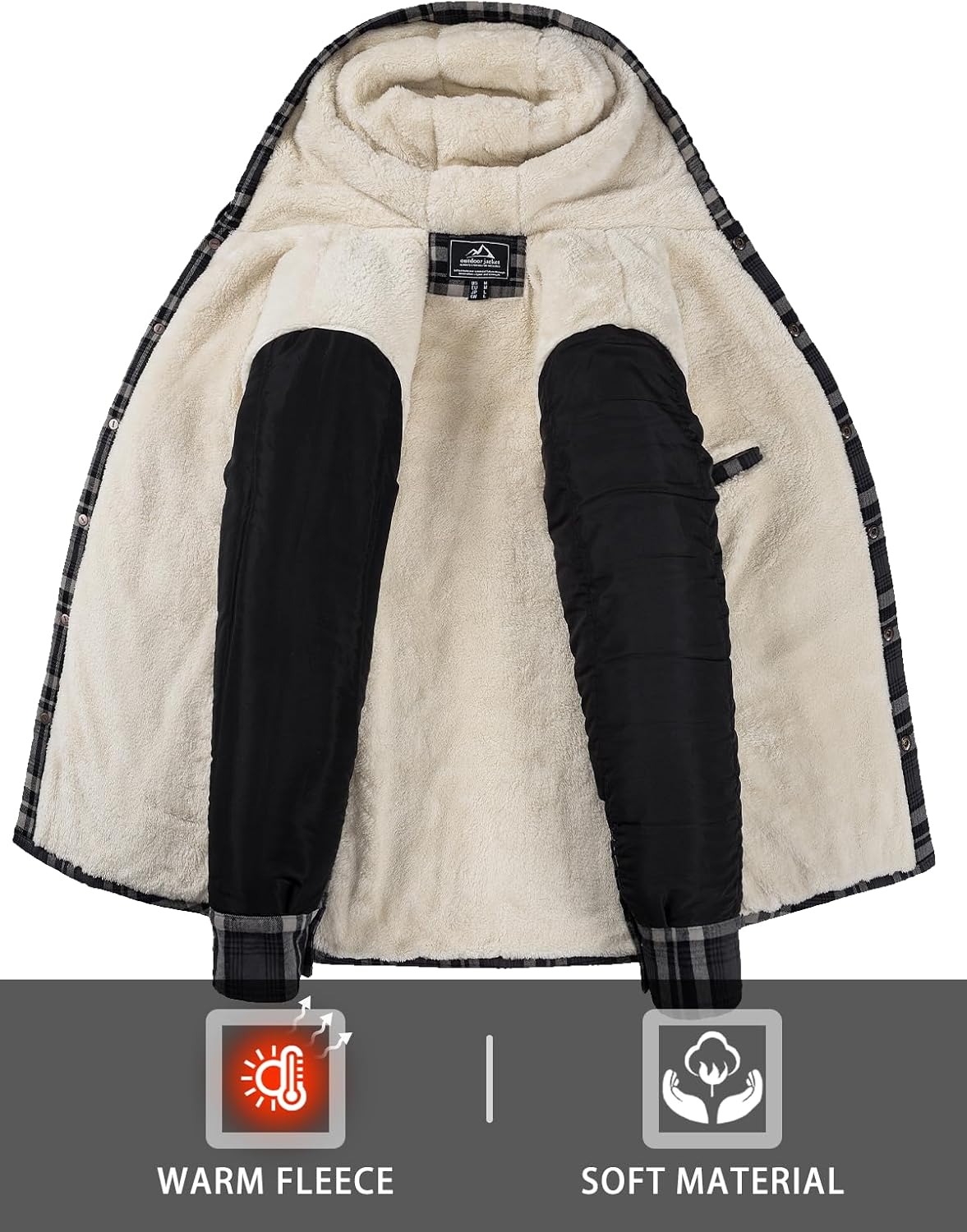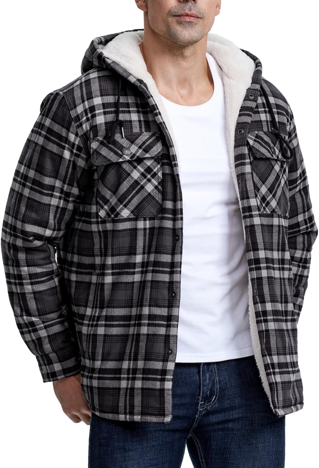 CRYSULLY Men’s Flannel Jacket Hooded Plaid Jackets Cotton Sherpa Lined Jacket Winter Button Down Jackets with Pockets