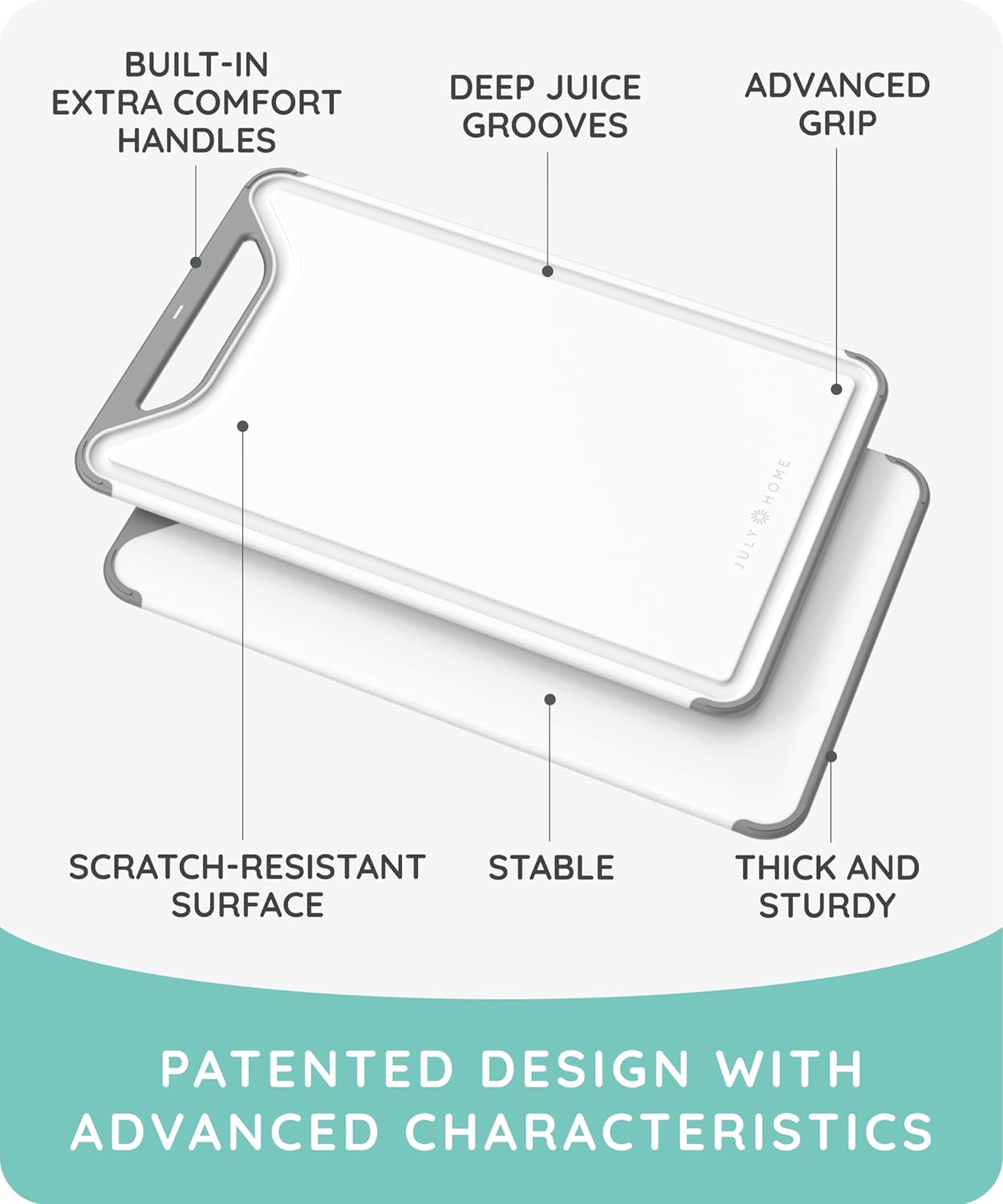 🎨 VERSATILE DESIGN! Cutlery lovers adore this set of premium cutting boards for kitchen use due to their sturdy construction, incredibly hard-wearing surface, and stunning aesthetics! These versatile plastic cutting boards can be used for cutting, chopping, slicing, and even entertaining. Thanks to their non slip cutting board design, you can prep without the fear of your board sliding as you chop too!