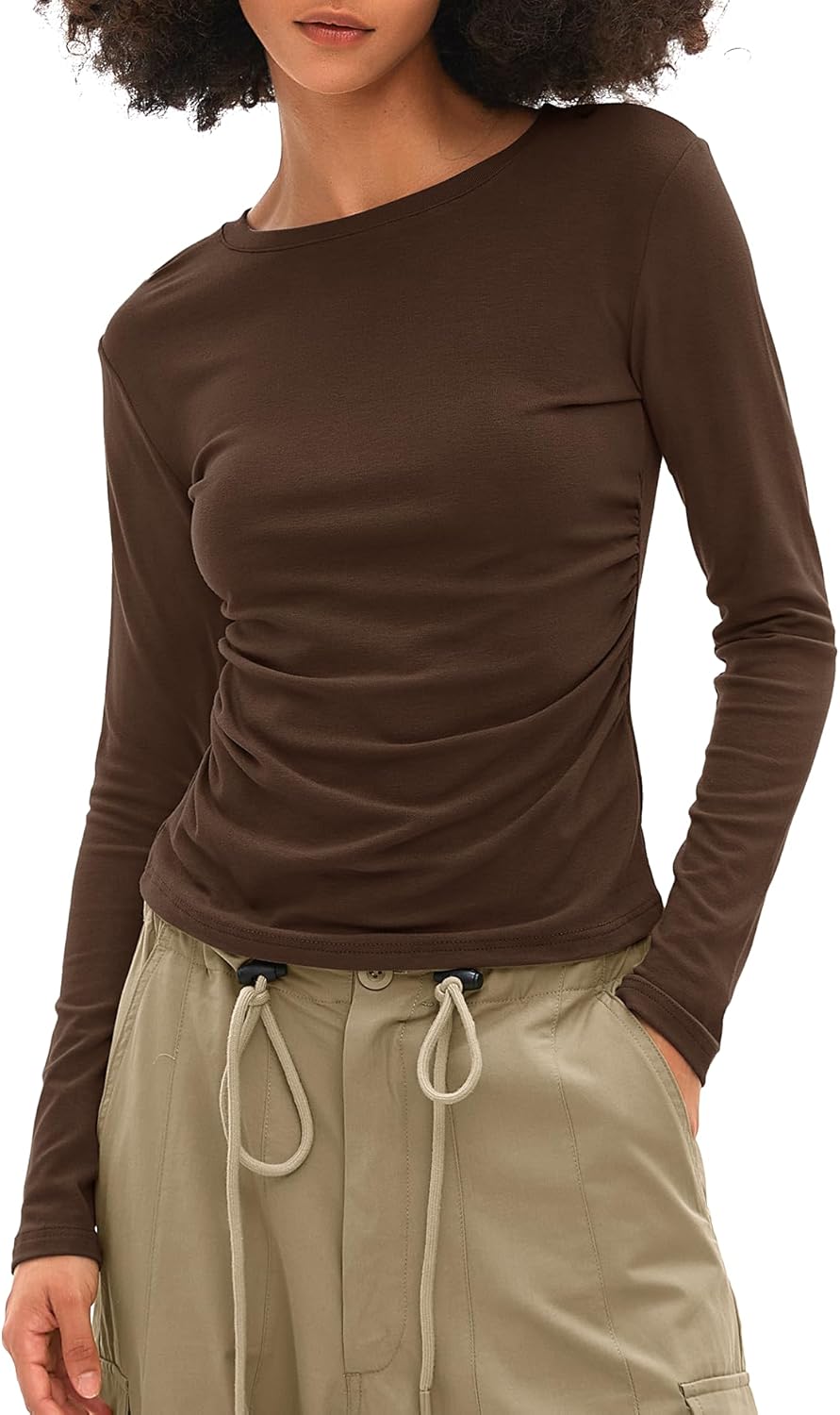 Brand: Darong Detail: Slim-fitting silhouette with a classic crew neckline,long sleeve,Ruched detail two side,solid color,plain undershirt. Fabric: 90% Rayon 10% Spandex,High quality,Super stretchy. Fit: Slim fit,Solid color. Category: Long sleeve Tops,Womens tops,Going out tops,Basic T Shirts,Y2k tops. Match: suitable for everyday wear and easy to style with a range of bottoms, such as jeans, leggings, or skirts. Occasion: A basic fall tees that suitable for all occasions. Washing Instruction: Hand wash or machine wash cold,non-chlorine bleach,do not tumble dry,cool iron,do not dry clean.