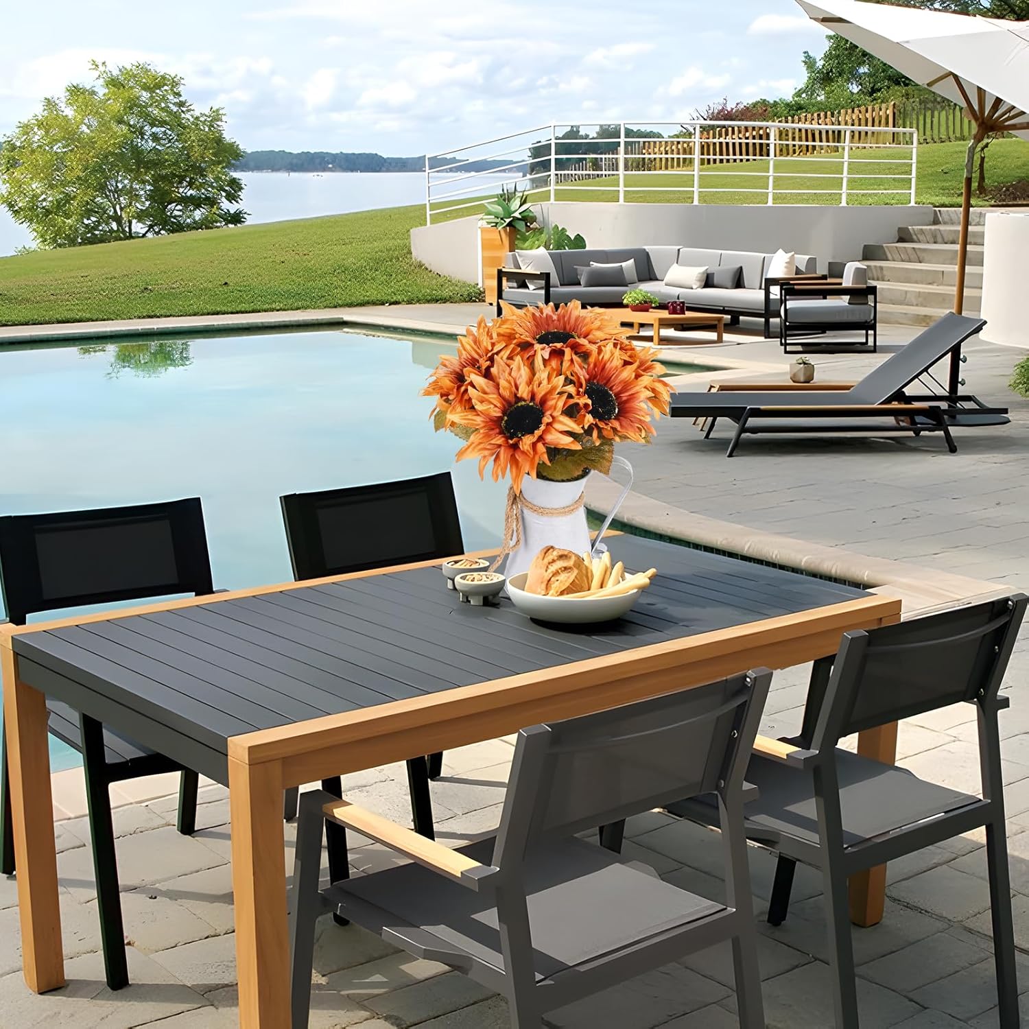 【Realistic Appearance】 Our artificial sunflower decor is made with high-quality eco-friendly PE material, which gives it a natural-looking appearance. The full and soft flowers look just like the real thing, making them perfect for indoor use or as kitchen decor for an outdoor wedding or patio party