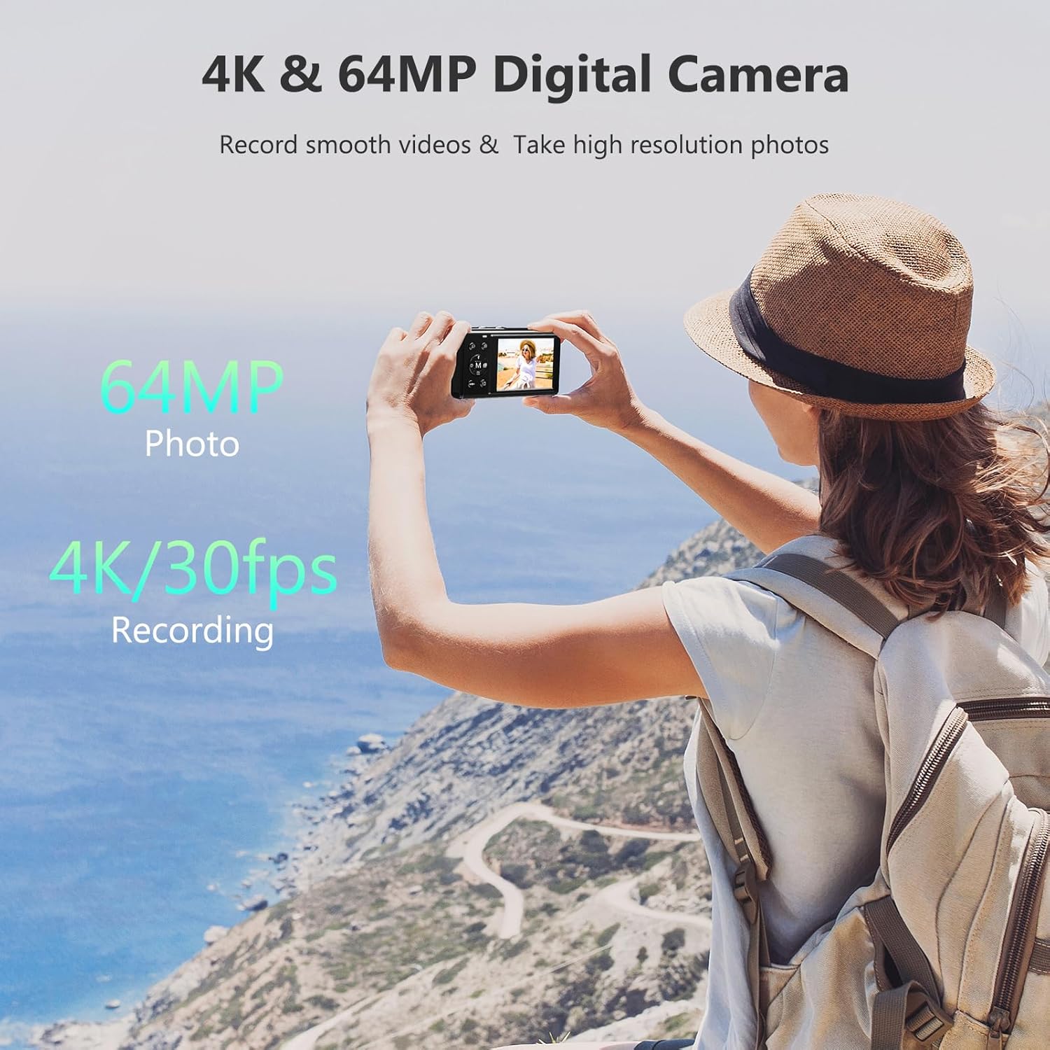 Digital Camera Cheap, 4K 64MP Vlogging Camera with WiFi, 16X Digital Zoom, Small Kids Digital Camera with 32GB Micro SD Card, Two Batteries, Lanyard, Camera Bags for Adults Boys Girls (Black)