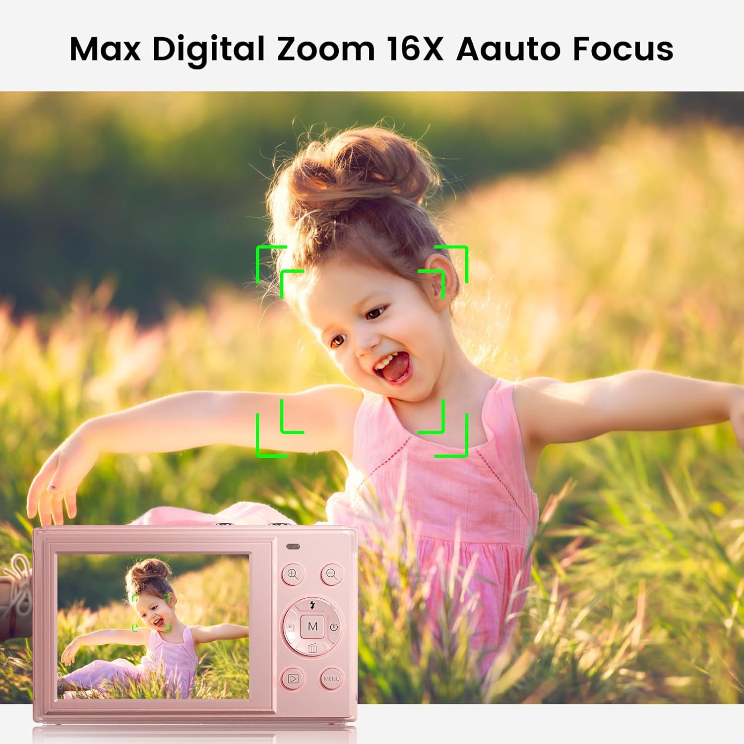【16X Digital Zoom & Flash Light】 The kid’s digital camera features a 2.8-inch IPS screen and a 16X digital zoom. Whether capturing the details of a insect’s wings in your backyard or a school performance from the back row, the W/T button allows you to zoom in or out effortlessly. The point and shoot camera also includes a built-in flash, adjustable with a simple press of a button, enabling clear photos even in low-light conditions such as twilight camping trips or indoor birthday parties.