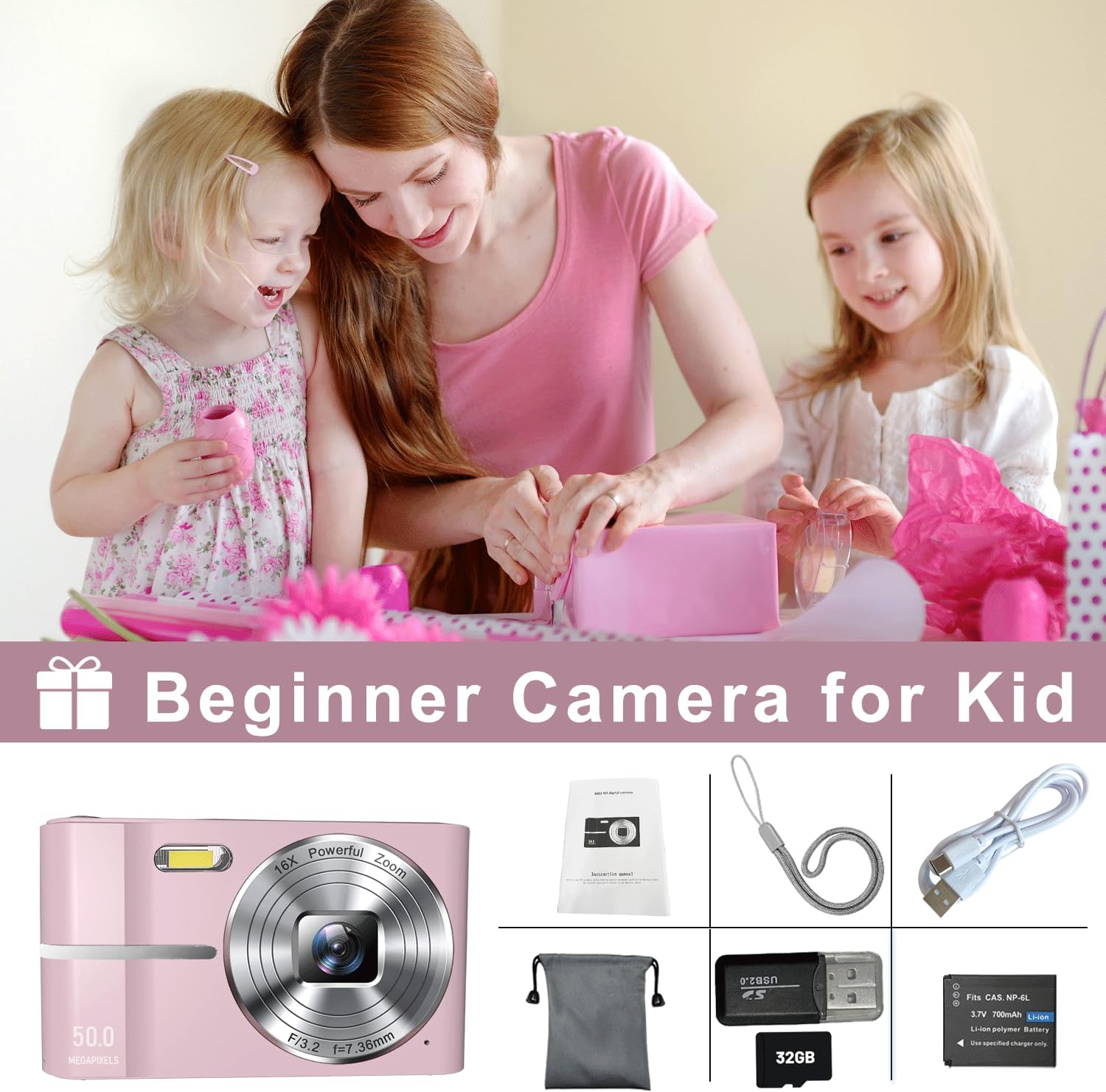 【Cultivate Interest,Stimulate Imagination】In photo mode,kids digital camera supports 7 filters effects and white balance.8-15 kids could choose their favorite scene according to different ideas to stimulate their imagination.The package comes with 1x battery,1x 32GB SD card,1x USB cable, 1x kids digital camera,1x Card reader,1x lanyard and camera bag.