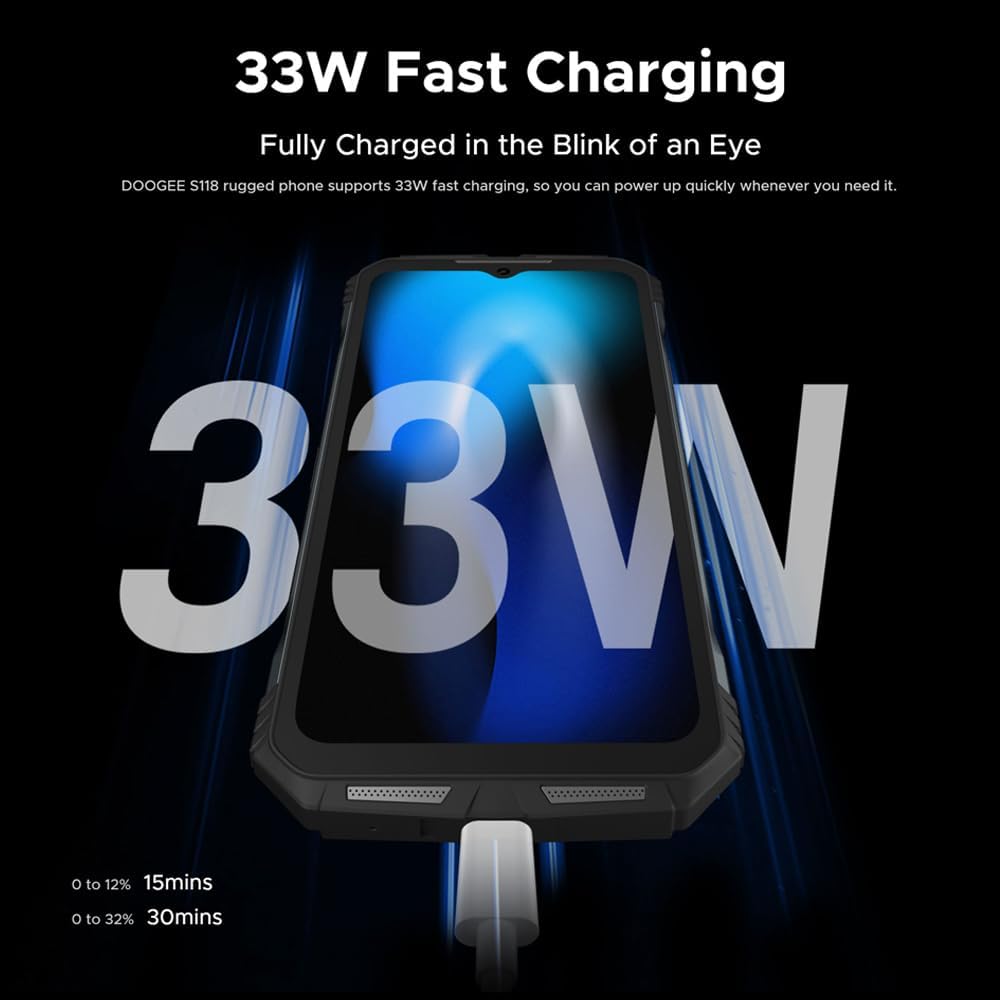 10800mAh Big Battery Unlocked Smartphone Android + 33W Fast Charging + OTG:Doogee S118 Phone is equipped with a large 10800 mAh battery with a standby time of 960 hours.33W fast charging,DOOGEE S118 rugged phone also supports reverse charging for smartphones, laptops, and more.is your best travel partner.