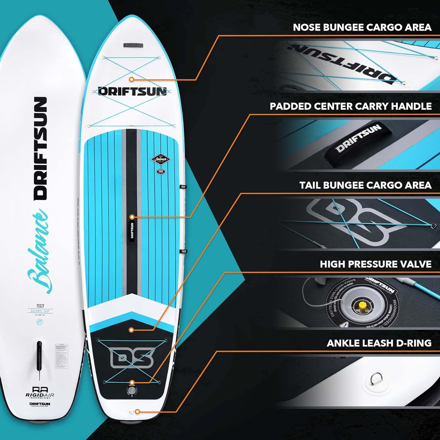 The Driftsun Balance Inflatable Paddle Board is the ultimate water experience for those looking to improve their fitness and flexibility while having fun! This package combines the highest quality materials, workmanship and top notch accessories. Driftsun paddle boards were born on the lakes and rivers of Northern California. Thoughtfully designed, constructed and tested by a team that lives to paddle.