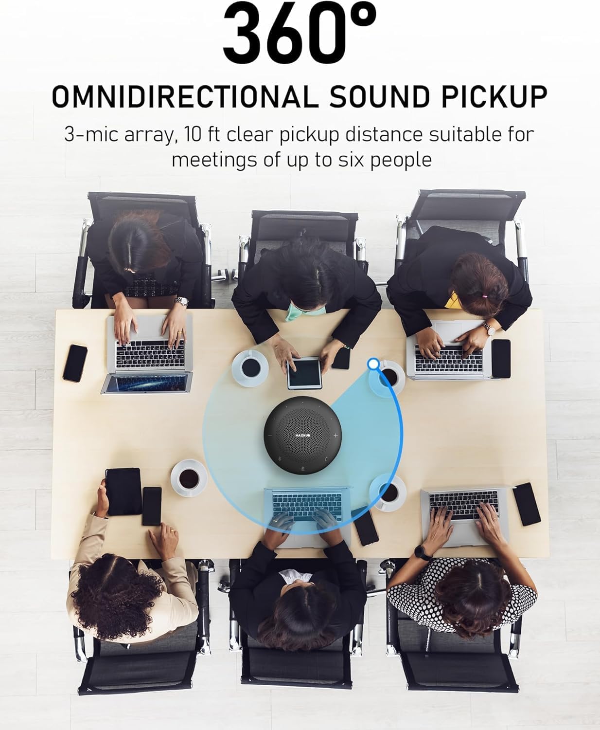 【Enhanced Voice Pickup】 The BM11 Bluetooth speakerphone is equipped with an omnidirectional three-microphone array for seamless sound pickup. The 10-foot radius pickup distance is suitable for small to medium-sized conference settings in spaces of around 300 square feet