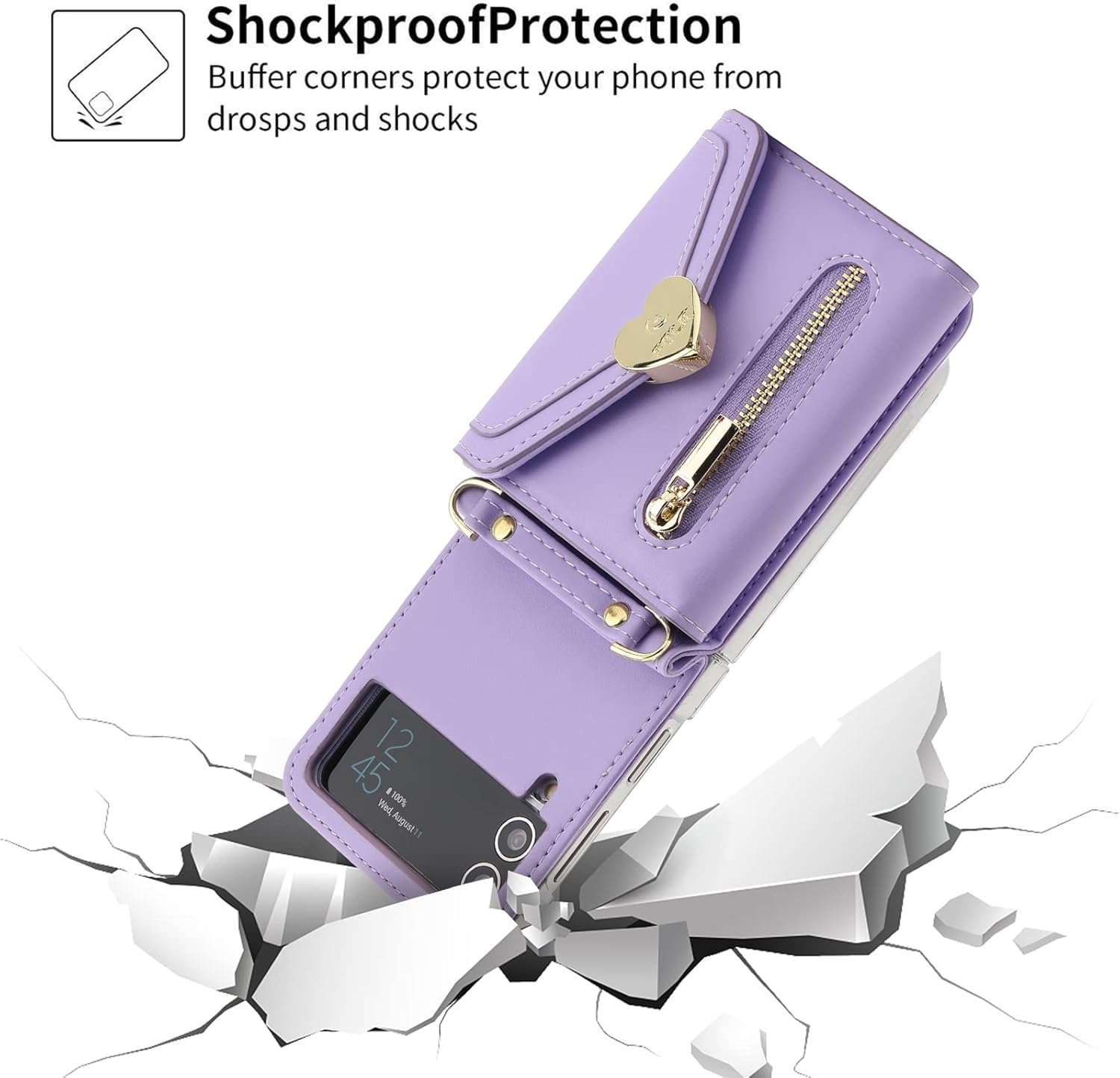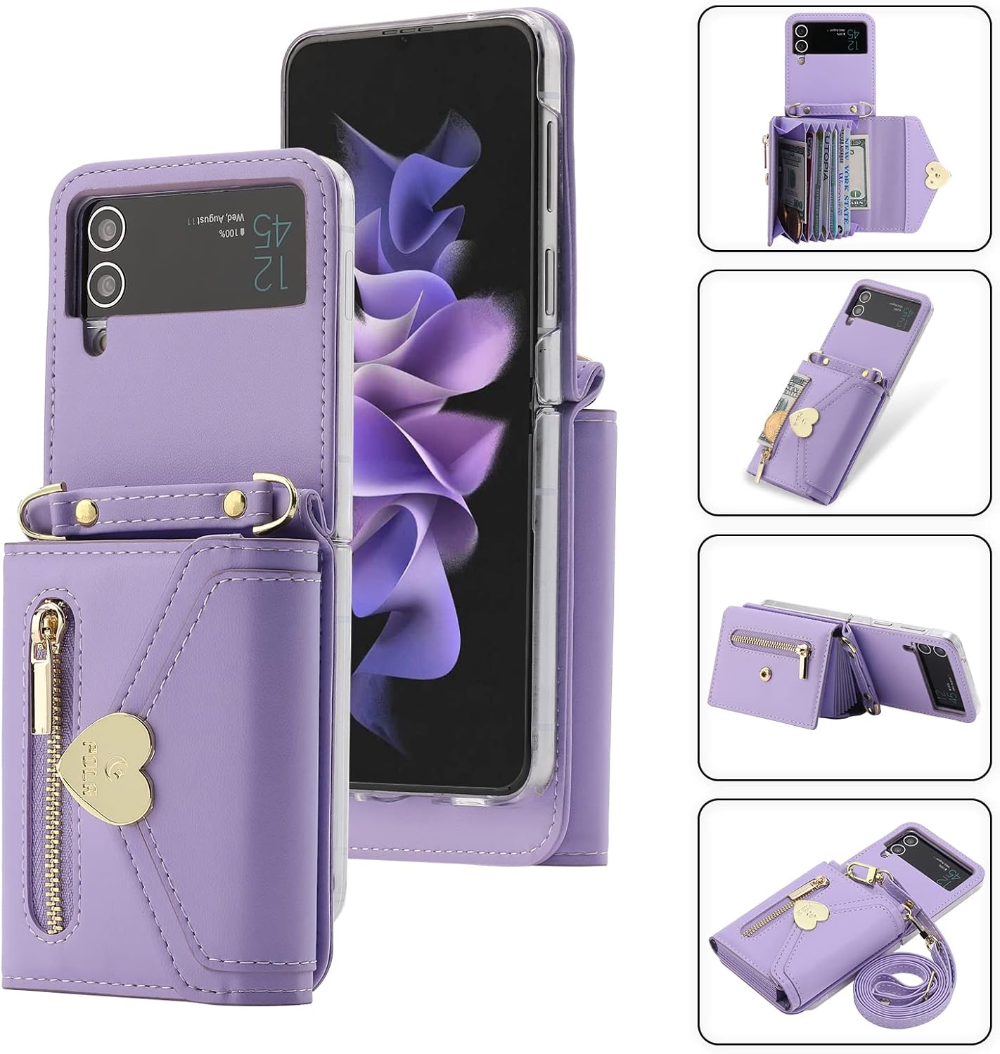 for Samsung Galaxy Z Flip 3 Case with Love Flip Wallet, Large Capacity for 8 Card Slots, and Long Strap – a Mini, Fashionable Crossbody Bag for Young, Stylish Women Shopping(Z Flip 3,Purple)