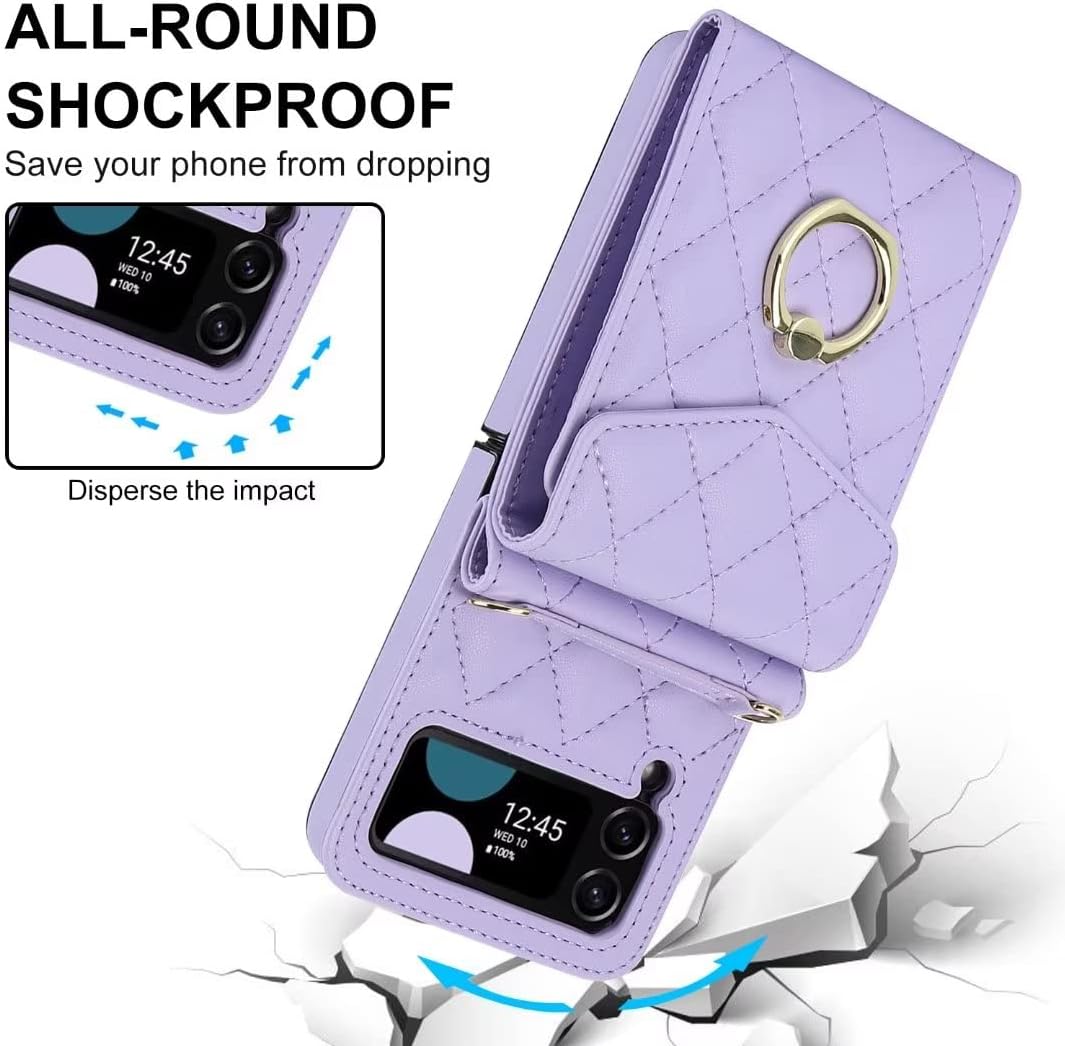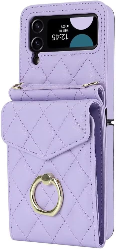 for Samsung Galaxy Z Flip 3 Wallet Phone Case with Ring and Adjustable Crossbody Strap, Stylish and Muti-funtional Accordion Style Flip Case with 4 Card Slots for Women and Girls.(Purple)