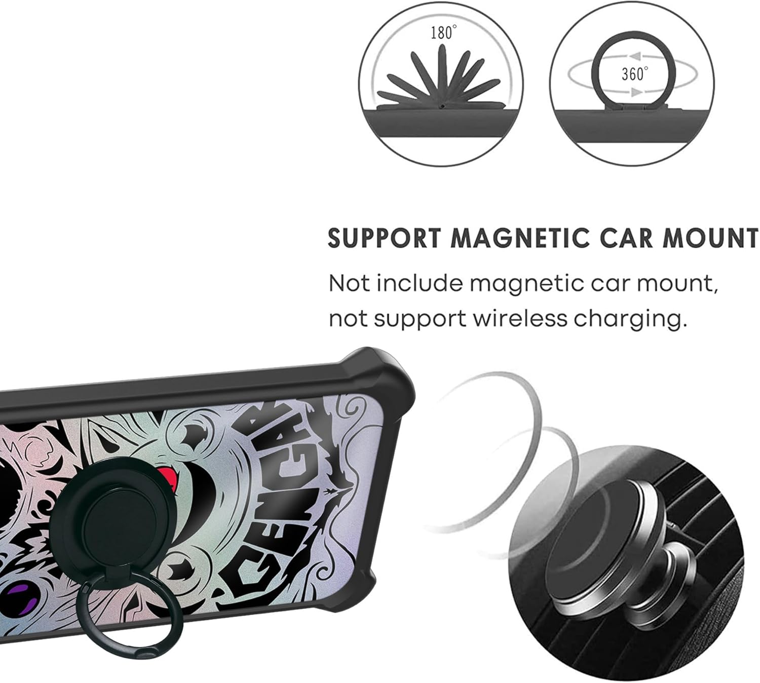 Adhesive metal finger ring support [you can choose to stick to Case, or separate use], 360 degree rotation + car bracket magnetic suction