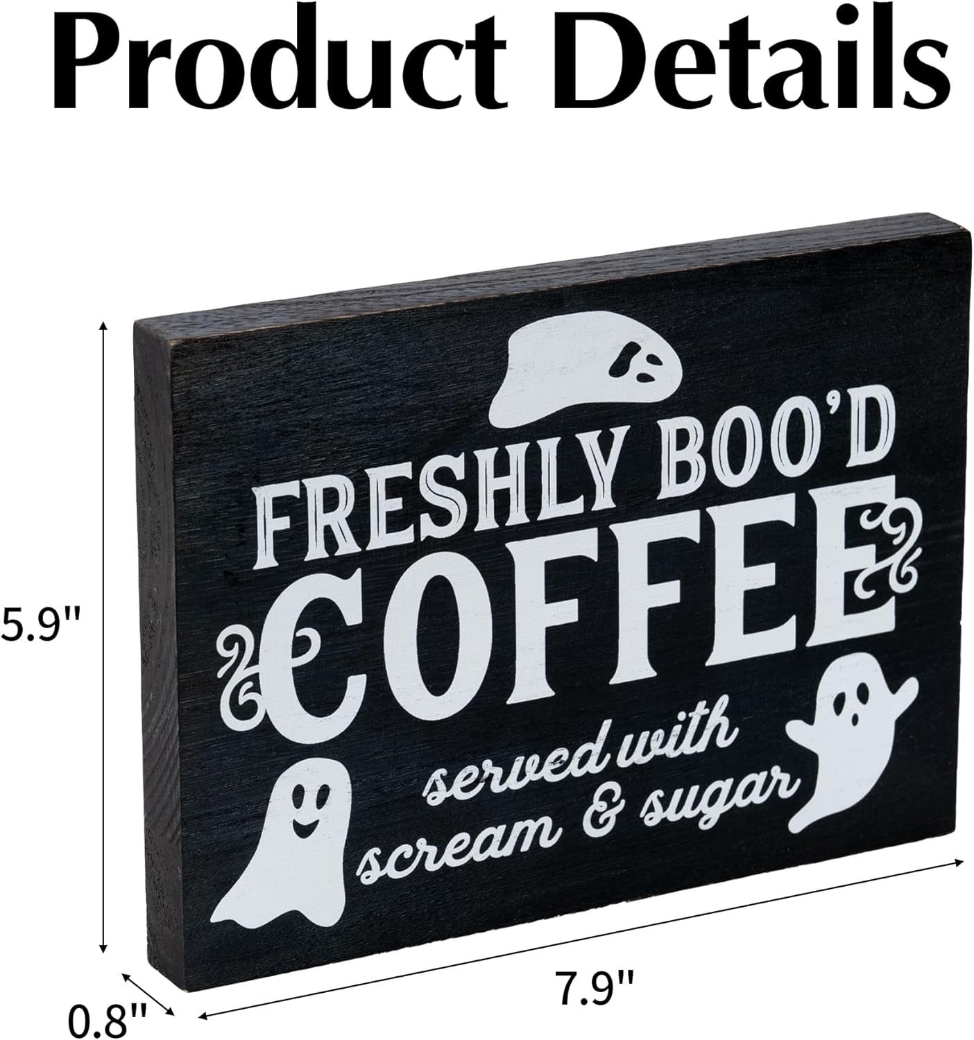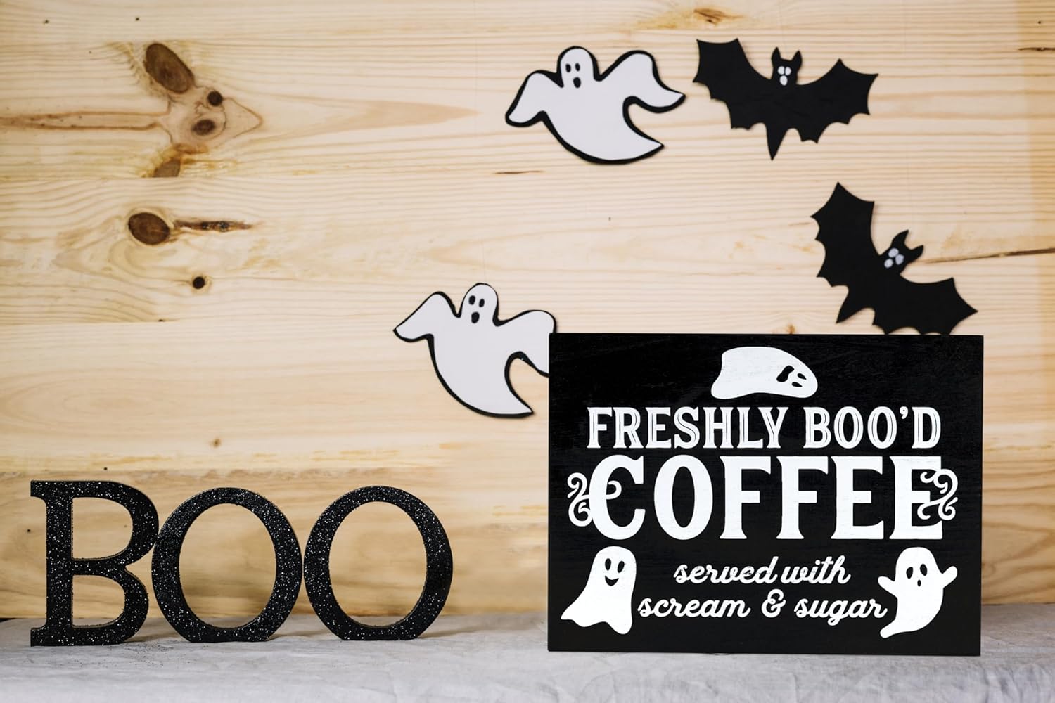 Freshly Boo’d Coffee Halloween Sign Cute Halloween Coffee Bar Decor Wooden Kitchen Decor Accessories Rustic Halloween Home Indoor Decor Tabletop Ornament (Black)