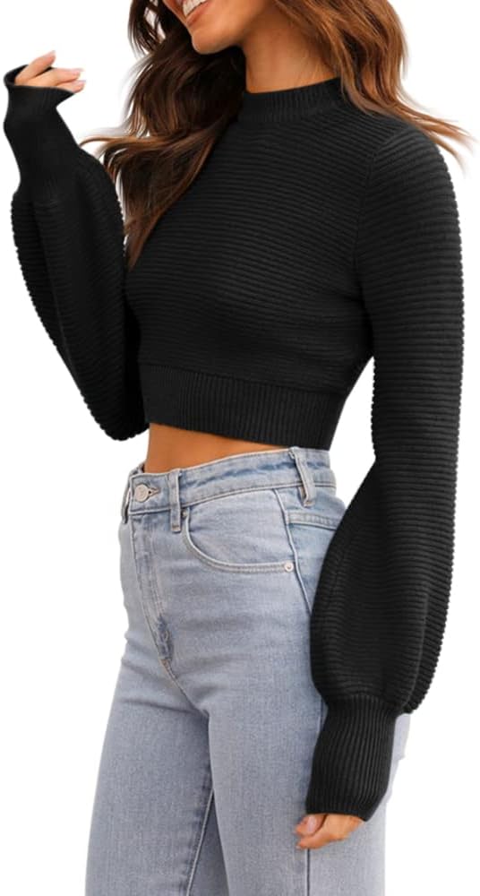 This casual crewneck cropped sweater, long balloon sleeve, slim fit, ribbed knit, solid color, short length, trendy, soft fabric, comfort to wear