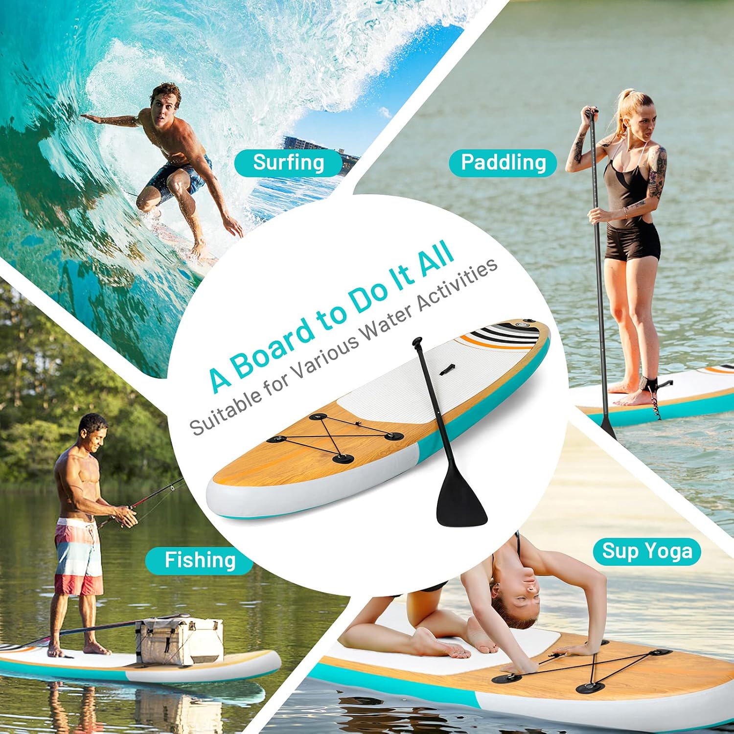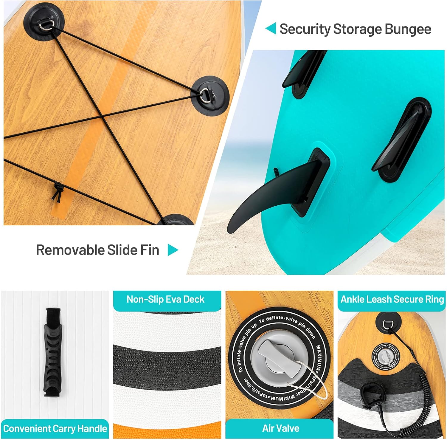 【Easy to Carry and Store】It comes with a carry backpack, when the board deflated and rolled up, you can easily store and transport it to wherever you want to go. And when you inflate the paddle board, there is a carrying handle on the board, which is really convenient for use.
