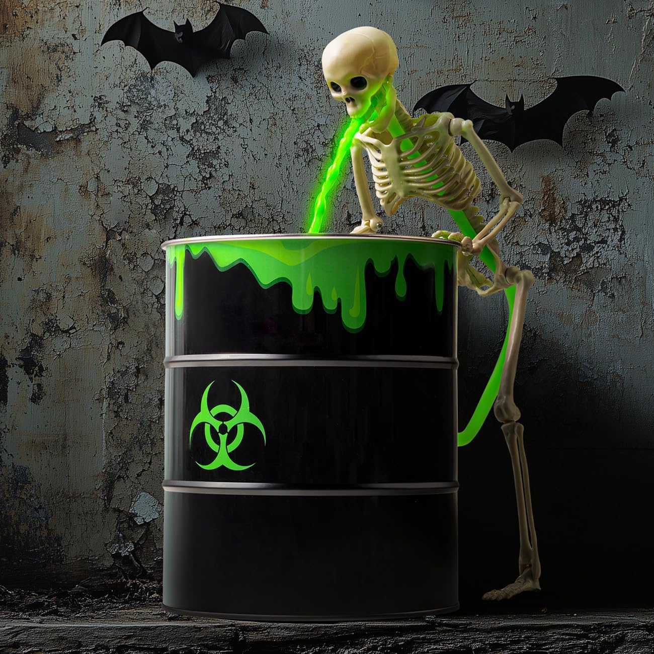 Whether you’re hosting a Halloween party or just looking to spook up your space, this skeleton vomiting into a barrel with its glowing green liquid will be the highlight of the night. It’s a conversation starter and a perfect photo opportunity!