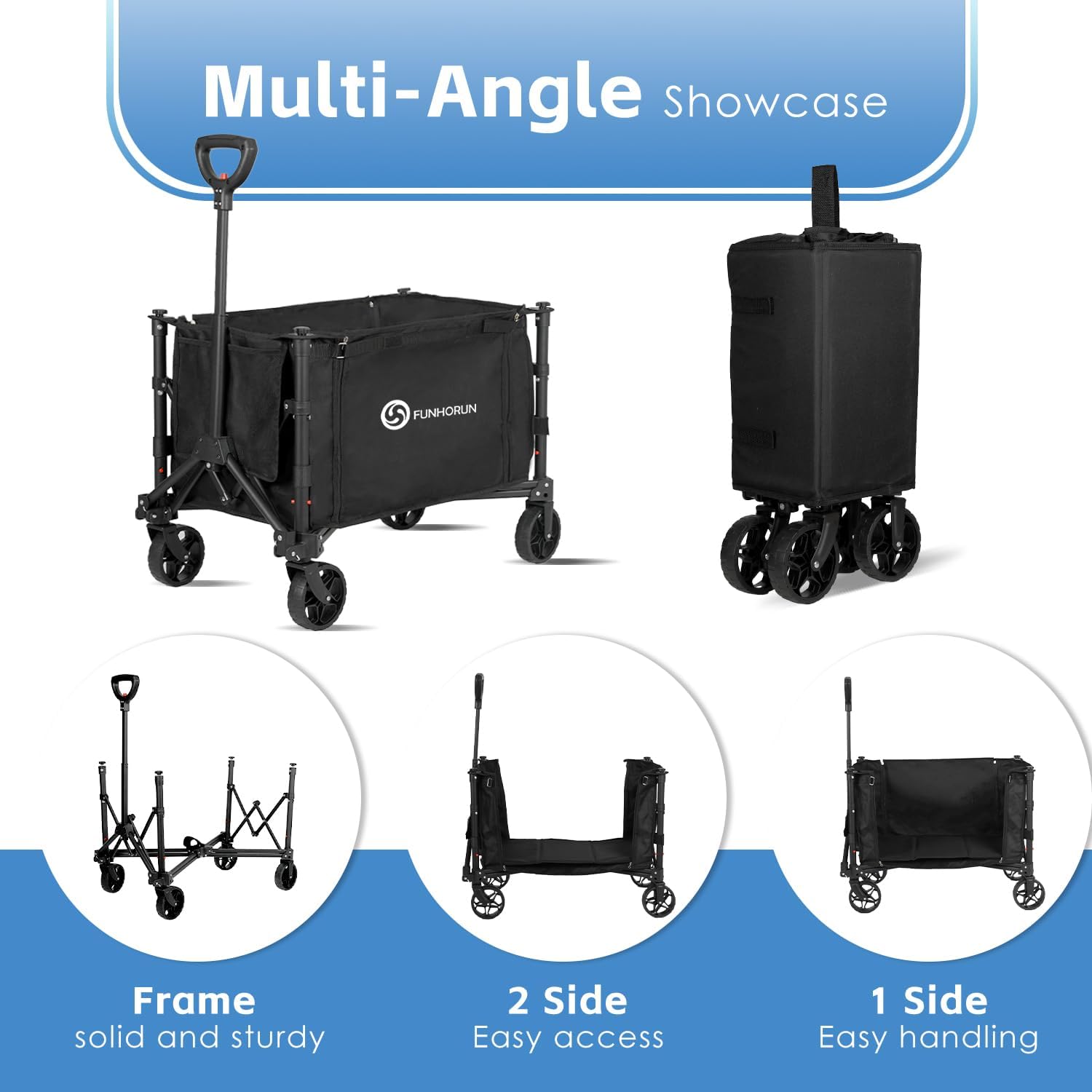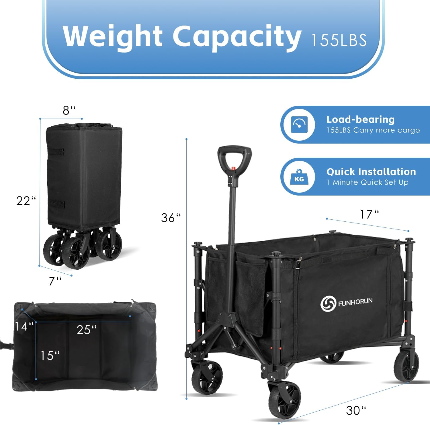 Heavy Duty Collapsible Wagon Carts, Compact Foldable Utility Wagon with Versatile Canvas for Grocery, Camping, Shopping, Garden, Sports, Load up to 155LBS/120L, Black