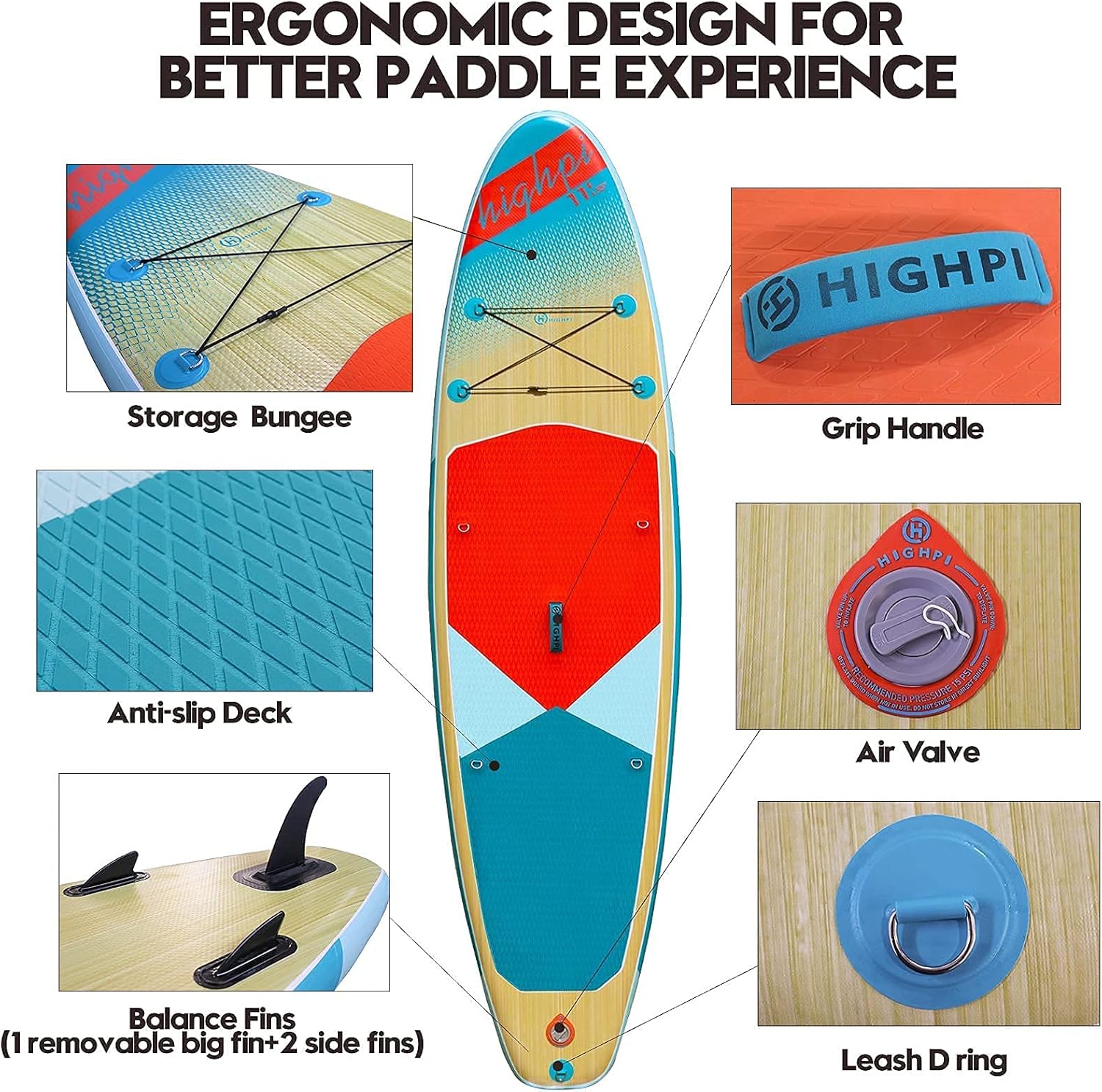 【Bigger Size More Weight Capacity Easier Balance】HIGHPI inflatable paddle board is 11’long x 33”wide x 6” thick, with weight capacity up to 350lbs.The extra wide SUP design is easy for beginners to stand up and keep balance. The triple bottom balance SUP fins and the sporty shape of the paddle board also allow for a fast tracking easy steering experience which is similar to a rigid surfboard. It is an ideal all round paddle board for adults, teens, youth and with pets of all skill levels.